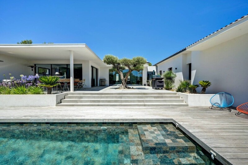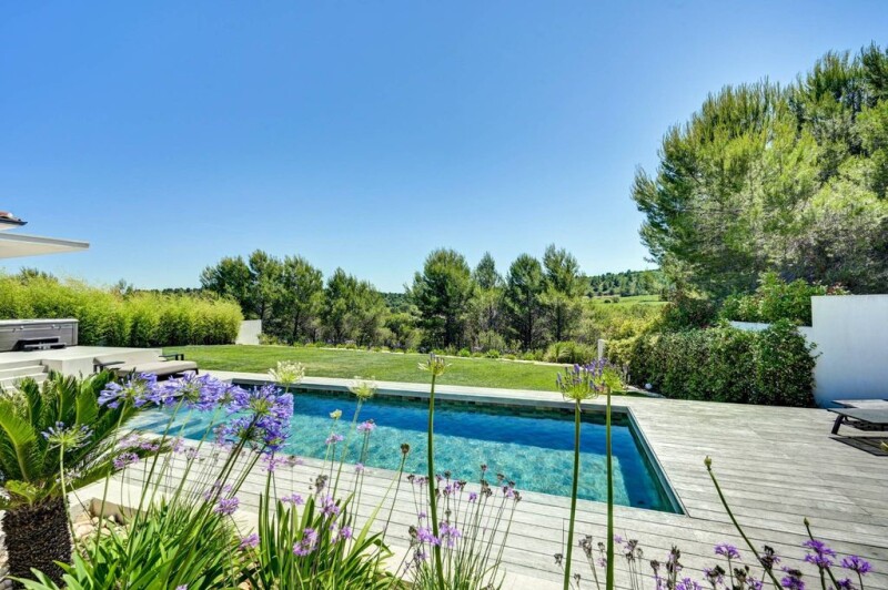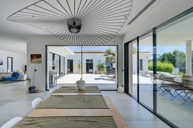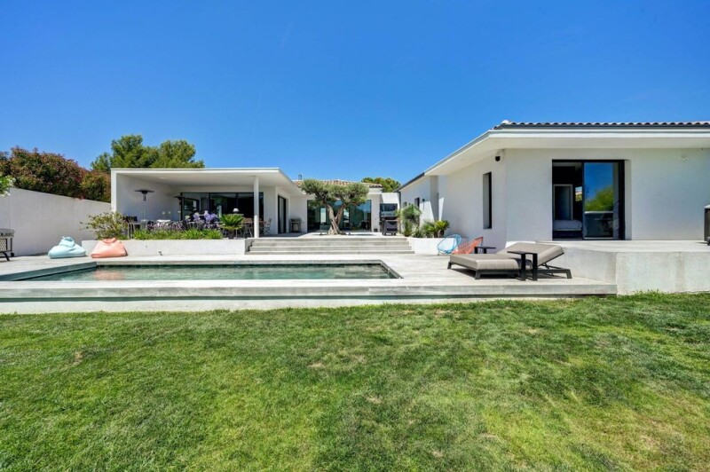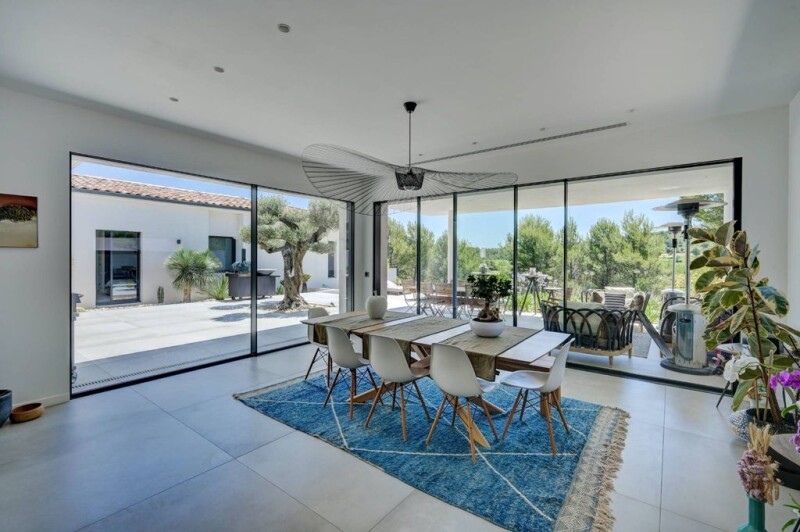 This sumptuous contemporary villa located in Ventabren, just 15 minutes from the city center of Aix, combines elegance and modernity on a surface of 216m². Upon arrival, an entrance hall guides you to the different areas of the house. To your right, a spacious living room/ living room of 85m² bright thanks to large windows, an open kitchen equipped Gaggenau and a scullery for cooking enthusiasts. On the left, a sleeping area offering privacy with a master bedroom, dressing room and adjoining shower rooms, two other bedrooms with shower room, a guest room and amenities. The house is equipped with an air conditioning system, heated and refreshing floors for optimal comfort. The 1500m² plot offers a spacious terrace, swimming pool and views of the vineyards. Security is assured, and the villa is close to local amenities. Do not miss the opportunity to visit this exceptional villa to discover its luxury, comfort and unique lifestyle.