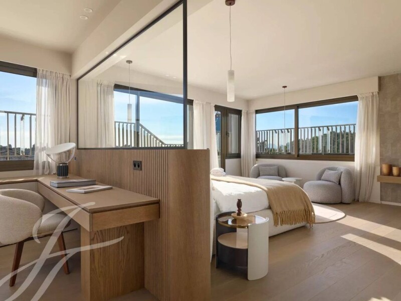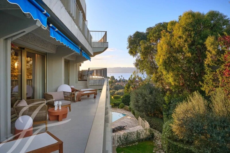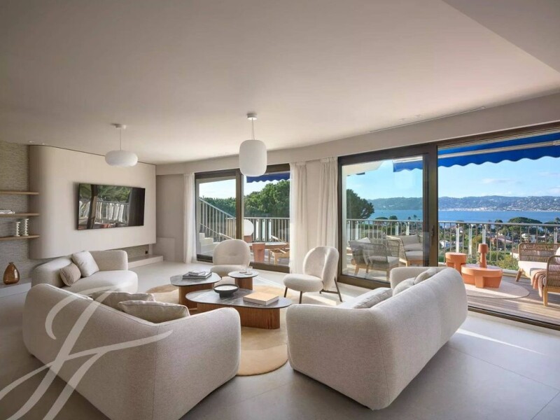 In a beautiful residence on west side with swimming pool. Exceptional apartment of 281 sqm with terraces of , with an incredible sea view over the bay of Juan les Pins, the Lerins Islands and the Esterel hills. It comprises: An entrance opening onto a double reception room with open kitchen, a master suite with dressing room and bathroom, four further bedrooms with their own shower rooms. Panoramic sea views from the living room and master suite. Two cellars, two garages, two luggage storage rooms. Swimming pool and janitor in residence.