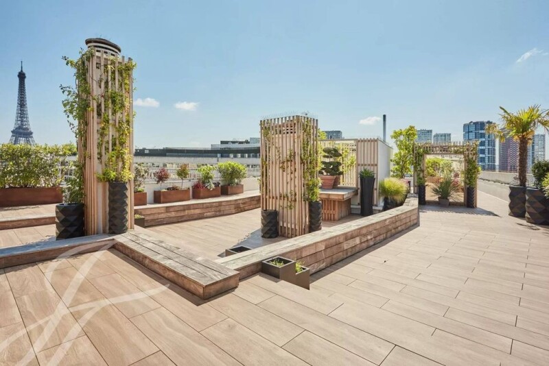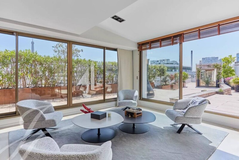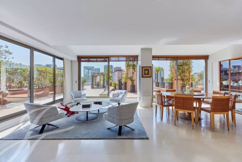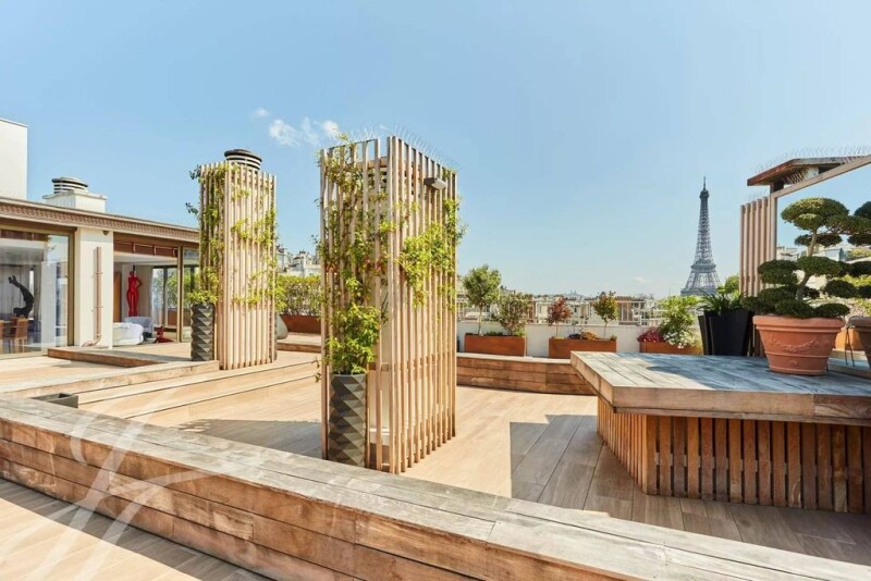 Paris 16. Between the gardens of Passy and the Maison de la radio. We offer a penthouse of 296 sqm located on the 9th and top floor with a large terrace of 409 sqm on one level. The apartment is composed as follows: entrance, first living room, second living room, dining kitchen, very large master suite with gym and hammam, two other bedrooms, a bathroom. Many amazing unobstructed views of the Eiffel Tower from the apartment and the terrace. Two cellars and a parking space in the basement.