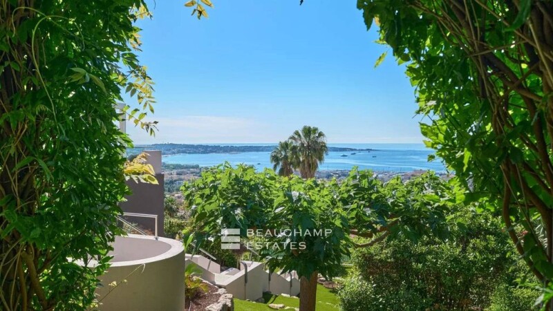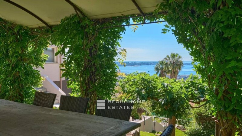 Sole Agent. Located on the heights of Golfe-Juan, beautiful modern villa offering superb panoramic views of the sea and Cap d'Antibes. With a surface area of approx. 200 sqm, it is composed as follows: First floor: entrance hall, living room, dining room, fully equipped kitchen and back kitchen/laundry room, master bedroom with en suite bathroom and independent access. Garden level: two bedrooms sharing a shower room, one en suite bedroom, separate toilet. For your guests, a one bedroom apartment. Landscaped grounds of approx. 1000 sqm with swimming pool. Double garage + outdoor parking for 4 cars. Energy class : C - Climat class : A / estimated annual costs for standard use : between 1,720€ and 2,380€ (ref year 2021). Information on the risk to which this property is exposed is available on the Geohazards website : www.georisques.gouv.fr.