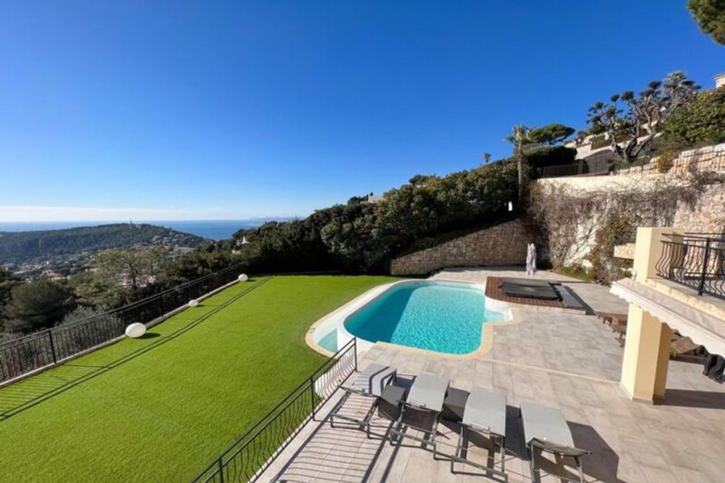 Beautiful property, located in the private and secure Domaine du Castellet, a few minutes from the Col de Villefranche, between Nice and Monaco. The seaside is accessible by car in ten minutes. It enjoys absolute calm and a panoramic view of the sea and the Rade de Villefranche. The villa was built in 2006 in a Provencal style, with beautiful volumes, 270 m2 of living space on 2 main levels and 87 m2 of finished basements. Ground floor : Large living room with glass doors opening onto a covered terrace and accessing the garden and the swimming pool. Accommodation - Fully equipped independent kitchen, opening onto a covered terrace. Dining room for 8 people. Small TV lounge/office. Guest WC and dressing room. Level 1 : 2 bedrooms with a bathroom and a separate WC. 1 bedroom with shower room. 1 bedroom, opening onto a terrace and sea view, with bathroom equipped with a Jacuzzi bath 1 master bedroom with en-suite bathroom, a toilet, opening onto a large terrace with sea view. Basement : Laundry room, cellar, garage for 4 cars, gym to be equipped, storage room. The villa has air conditioning in all rooms and a underfloor heating system, WiFi, alarm system, large bay windows, heated swimming pool. Contact us today to find out more.