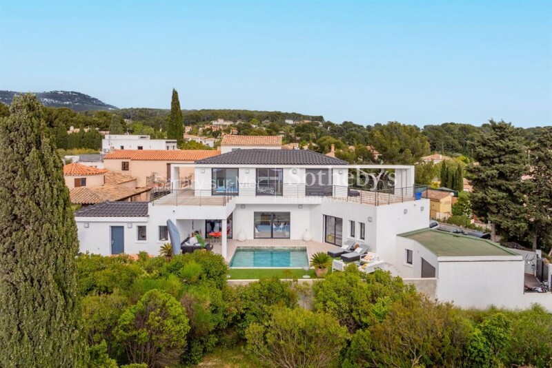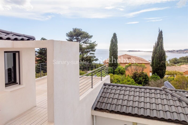 Between Sanary and Bandol, a very beautiful contemporary house of 198 sqm for sale with sea view on a plot of 800 sqm. Large living room of 70 sqm with open kitchen. Master suite on the ground floor. Utility room and laundry room. Upstairs, three bedrooms opening onto a large terrace of 70 sqm with full sea view. Outside, a heated 5x5 meters saltwater pool. Large garage for bicycles and motorcycles of 25 sqm tiled with shower. Three parking spaces within the property plus one outside.