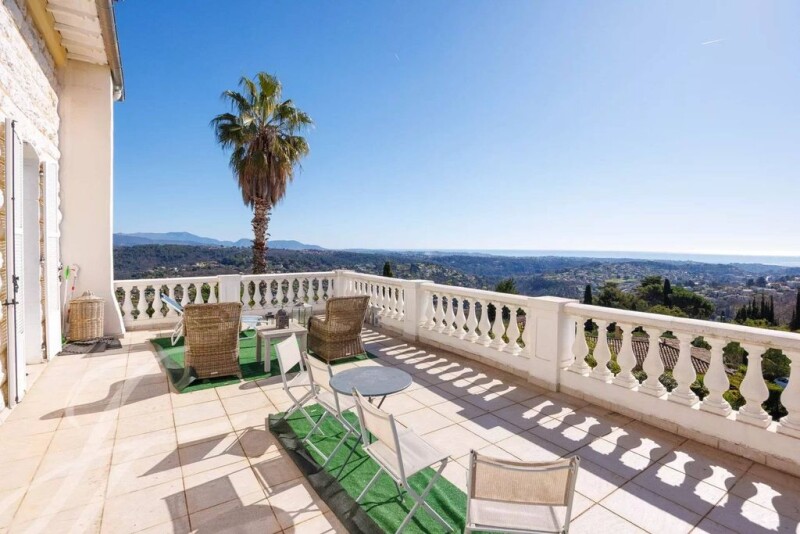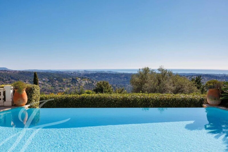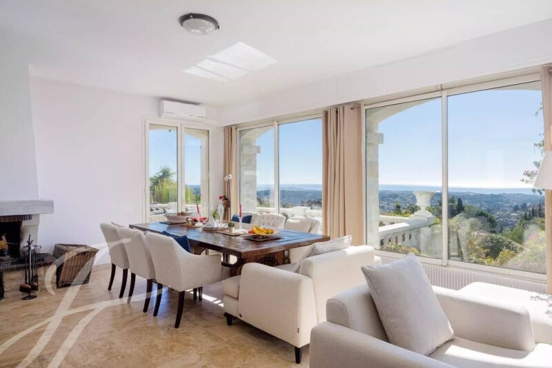 Located in the residential heights of Vence, this charming stone residence from the 1920s, approximately 240sq.m, offers an idyllic setting with panoramic views of the sea and the French Riviera. Its beautifully landscaped 1,500sq.m garden, enhanced by a stunning heated pool, invites relaxation. From the moment you step inside, the home’s elegant and welcoming atmosphere is felt. The spacious, light-filled living room, featuring a fireplace, and the separate fully equipped kitchen open onto a beautiful terrace, perfect for enjoying outdoor meals while admiring the Mediterranean scenery. This level also includes a lovely en-suite bedroom with a bathroom and toilet, a laundry room, a pantry, and a guest toilet. Upstairs, two exquisite suites each have their own bathrooms, while a magnificent 40sq.m terrace extends the pleasure of admiring the sea. The top floor houses a large cinema room, an additional bedroom, and a spacious shower room with toilet, offering the possibility of creating an independent apartment. A garage with an automatic door and two outdoor storage rooms add to the property’s convenience. Fully renovated with high-end materials, the house features a heat pump system for heating and cooling, underfloor heating in all bathrooms, double glazing, and a new roof. Secured by an alarm system with cameras, it is surrounded by a lush garden where olive and fruit trees complete this true haven of peace. État des risques et pollution: réalisé (2023-07-31).