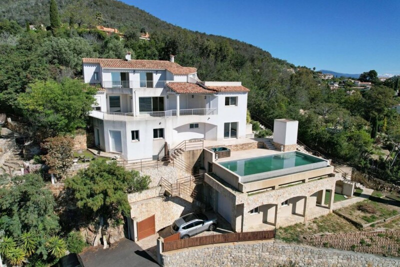 In the heights of Mandelieu la Napoule, in absolute tranquility, with no overlooking neighbors and just 10 minutes from the town center, discover this beautiful villa with a total area of 280m² on a 1610m² plot, featuring an infinity pool and panoramic sea and mountain views. The layout is as follows: On the ground floor, an independent three-room apartment of approximately 60m² with a living room and open-plan kitchen, a bedroom with sea view, a bathroom with dressing area and toilet, and an office. An additional room with a sauna, bedroom, shower room, and toilet. On the first floor, a double living/dining room with an open kitchen, a beautiful terrace with sea view, a space for an office or small bedroom with a shower room, toilet, and pantry. On the second floor, three en-suite bedrooms, two of which share a terrace with sea views. To complete this property, there is a large garage and outdoor parking. A must-see! État des risques et pollution: réalisé (2023-06-20).