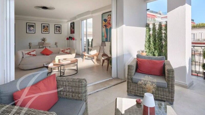 Superb renovation for this apartment on the top floor of a luxury residence between the Croisette and Rue d'Antibes. Comprising 2 bedrooms, 2 shower rooms, guest toilet, open-plan kitchen and 30 m² living room opening onto a spacious terrace, this apartment is ideally located for a pied-à-terre or main residence. A garage in the basement of the residence completes this property.
