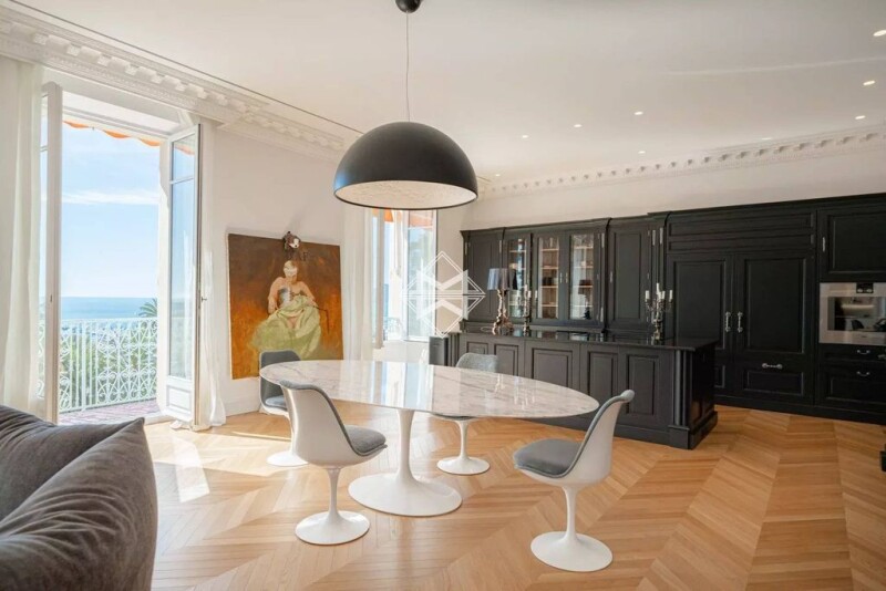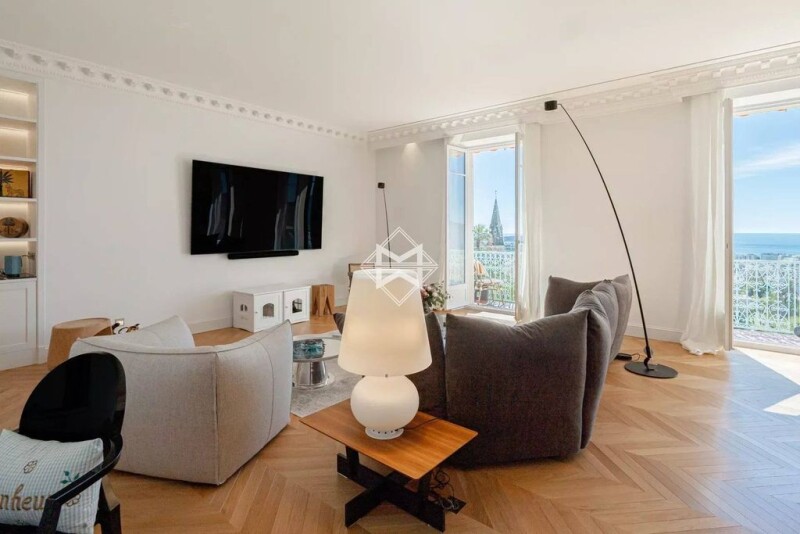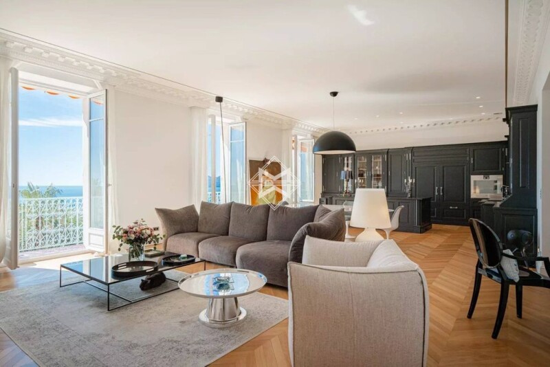 Superb 4-room apartment, located in a former historic hotel in Cannes, built in 1876 by the architect Laurent Vianay. The residence offers a park planted with palm trees and exotic plants as well as 2 tennis courts. The 216 m² apartment offers incomparable elegance and charm. A majestic 28m2 entrance hall leads to a double living/dining room area, with a custom open kitchen. The whole thing offers a volume of almost 80m2 with an opening onto a balcony and a sublime view of the sea and the bay of Cannes. It also offers three en-suite bedrooms including a master with breathtaking sea views. The laundry room is also a plus in this apartment. Plenty of storage space, high ceilings, high quality services. A cellar complete this property. Possibility of acquiring a garage in addition. Guardian in the building. Montant moyen de la quote-part de charges courantes 7,200 €/yearly.