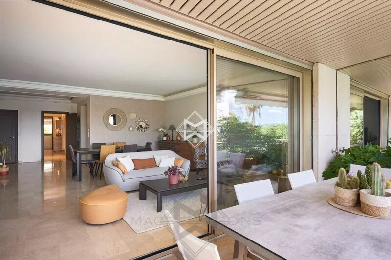 In a small high standing residence with caretaker and swimming pool, Benefiting from a panoramic sea view, Very nice 4-room apartment South facing with a large southwest corner terrace,, Of 123,55m2 (carrez Law), composed as follow : A vast living, opening on a large approx. 38m2 terrace With a beautiful view on the sea and the islands of Lerins, the swimming pool and the garden A master bedroom with sea view, a complete bathroom (bath, shower, toilet) storage cupboard 1 guest bedroom, with its bathroom and wc Fully equipped kitchen A third bedroom which can have its independent access is its shower room 1 double garage. A cellar Montant moyen de la quote-part de charges courantes 9,600 €/yearly.