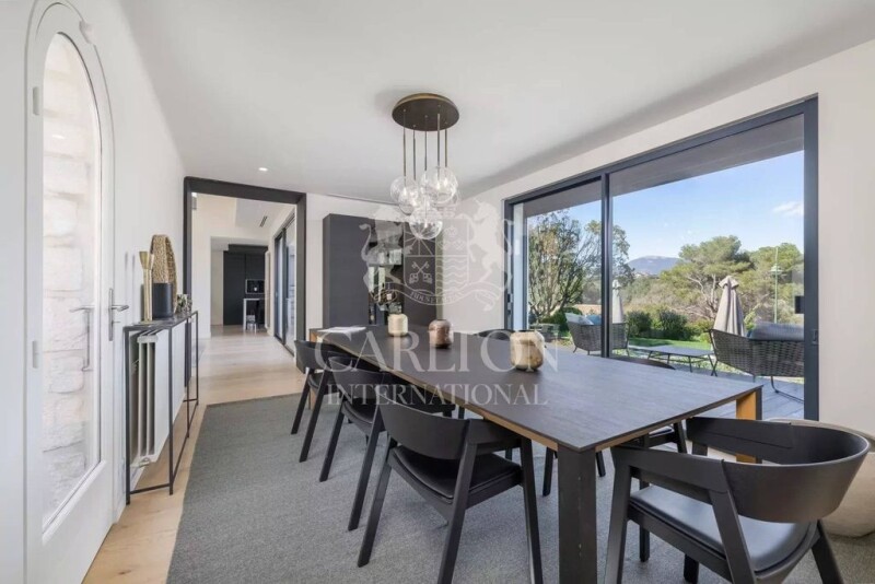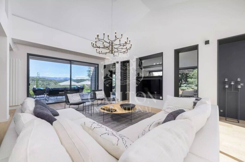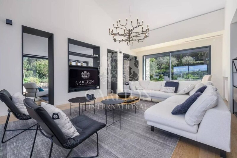 Sole agent - In one of the most secluded and sought-after estates in the Côte d'Azur, 5 minutes from the village and the sea, and 15 minutes from the airport, magnificent stone villa on one level;roport, Nice and Cannes, magnificent single-storey stone villa with contemporary interior featuring high-quality new renovation. Large through living room with high ceilings opening onto terraces and garden through numerous large bay windows, lounge, boudoir/library, spacious modern open kitchen, study, 4 en suite bedrooms with bathrooms, one of which is a master. Basement with cellars and 2-car garage. Possibility of purchasing the villa fully furnished. Superb, almost entirely flat, landscaped garden of 2,600 m2 with large swimming pool in absolute peace and quiet. No neighbours and beautiful panoramic views of the hinterland, hills and mountains. -- Agency fees, payable by the vendor, are included in the sale price. DPE : 72(C) / 14(C) Average energy costs are estimated at between 1120€ and 1560€ per year (average energy prices indexed to January 1, 2021, including subscriptions). Information on the risks to which this property is exposed is available on the Géorisques website REF 14512.