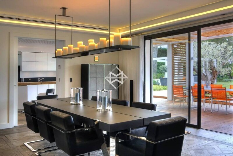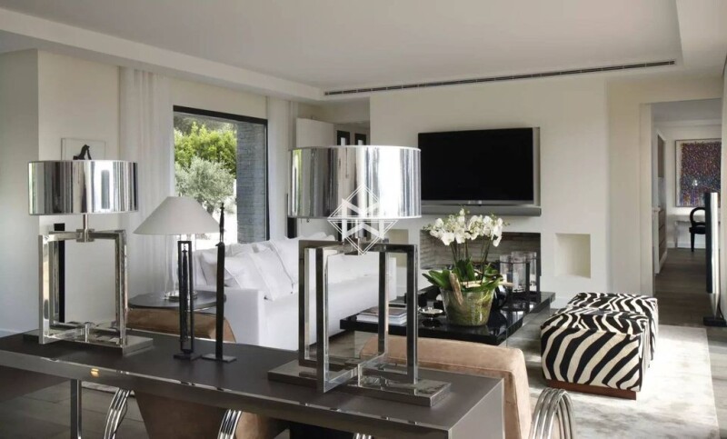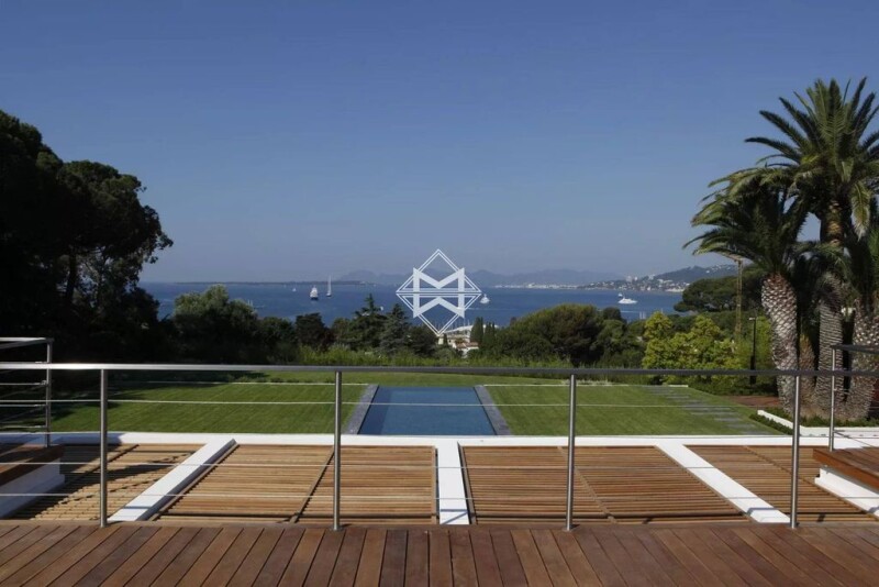 Exceptional location, for this outstanding contemporary villa, within a closed domain on the western side of the Cap d'Antibes. Located on a flat plot of land of 3 958m², this property offers an unobstructed sea view over the Lérins Islands and the Estérel massif. This villa was built with a high level of requirements. Entrance level : a living room opening onto a large terrace, an office and two large suites of more than 100 m² each. Garden level: a living room with a fireplace, dining room, cinema room, a wine cellar, an equipped kitchen, a laundry, three bedrooms with bathrooms; all opening onto spacious terraces, the garden, a magnificent swimming pool and pool house with gym. A 75 m² seperate apartment with living room and two bedrooms. A garage for 7 cars. Agency fees payable by vendor.