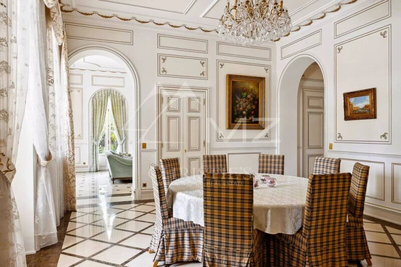 Magnificent Belle Epoque Style Property with Two Houses on a 2345 m² Plot. Discover this exquisite property located in the private and sought-after domain of La Garoupe in Cap d'Antibes. Nestled on a 2345 m² plot with a swimming pool, this exceptional residence comprises two houses, offering a luxurious and peaceful living environment. The villa, boasting 631 m², was built at the beginning of the 20th century for an English lord, combining historical charm with modern amenities. It features a grand entrance leading to a fully equipped kitchen, a spacious dining room, and a bright living room opening onto the pool. The villa also includes a TV lounge, a large office, and a game room. On the first floor, four en-suite bedrooms, including a sumptuous master bedroom with a dressing room and a large terrace with stunning sea views, await you. The top floor houses three additional bedrooms, each with its own bathroom or shower room, offering comfort and privacy. The basement is a true wellness area with a sauna, hammam, and shower, a gym with a jacuzzi, a large wine cellar, and a champagne cellar. Outside, the pool with jacuzzi, the pool house, and various terraces invite relaxation. A spacious garage can accommodate several vehicles. This unique estate in La Garoupe offers an exceptional quality of life, combining space, comfort, and luxury. A rare opportunity not to be missed.