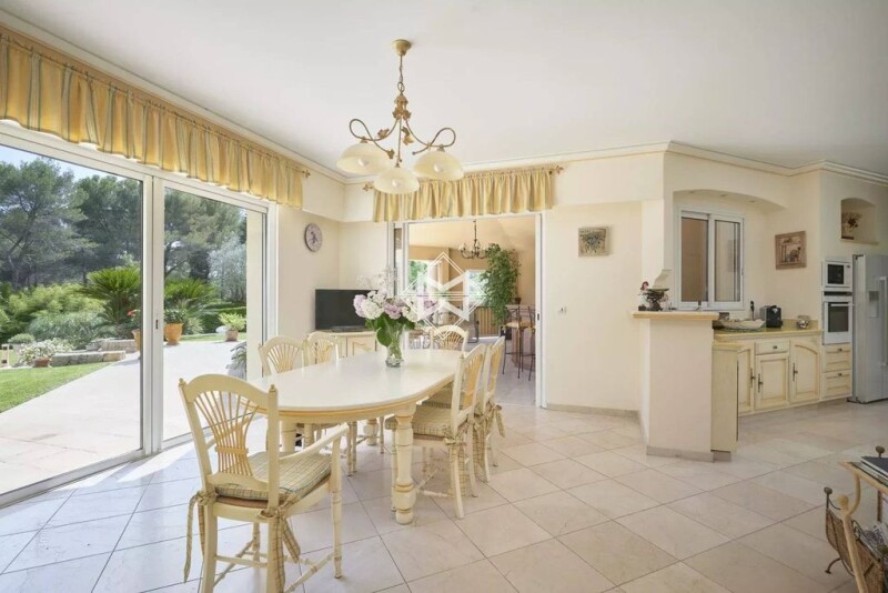 Nestled in the heart of an exclusive address in Mougins in one of the most coveted areas within walking distance of the shops and close to the golf courses and beaches of Cannes, this splendid property takes place on a vast sumptuously landscaped garden on which a lake has been drawn. This 430 m2 villa offers spacious spaces, all designed to let light in throughout the day and offer a splendid perspective on the exteriors where nature has been given pride of place. The property opens onto a majestic entrance with a double height sub-ceiling revealing the contours of the swimming pool and its surroundings. The double living room with fireplace, the dining room and the kitchen feature large openings allowing the places to free themselves from the limits between nature and architecture. In addition to this property with 4 en-suite bedrooms, there is a basement with English courtyards of 300 m2 hosting an extraordinary games room, a wine cellar, offices and a garage that can accommodate four vehicles. This splendid villa with the air of Provence offers its occupants a calm and peaceful place to live, ideal for enjoying the rays of the Azur sun in an intimate atmosphere in the corner of a jacuzzi. Possibility 5th bedroom.