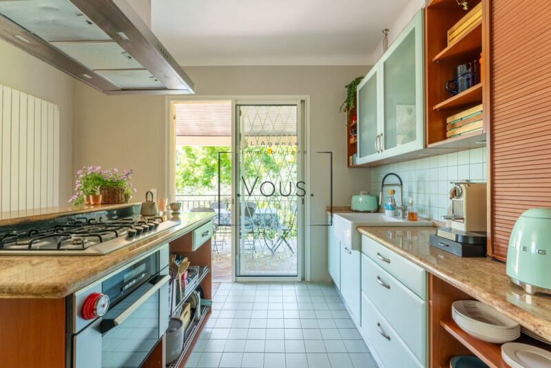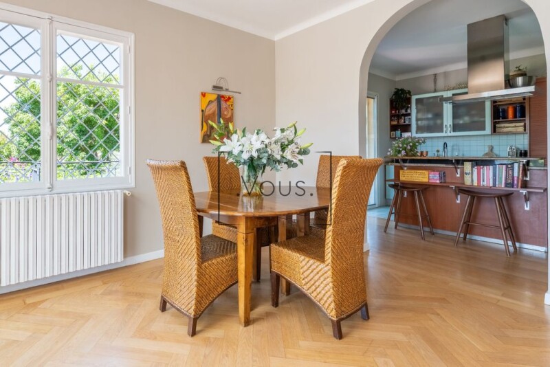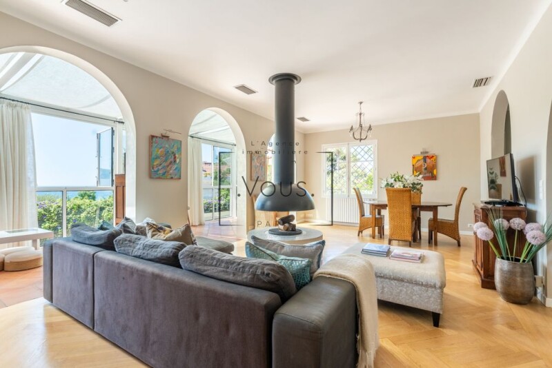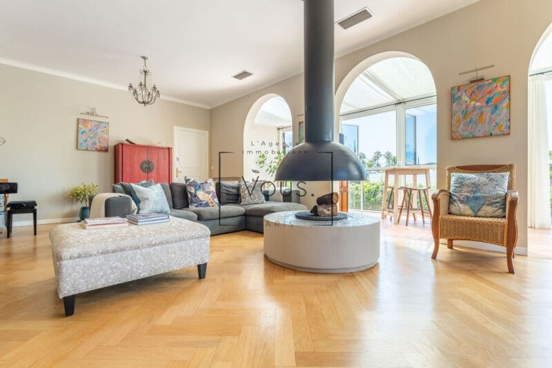 Like other emblematic places on the Côte d'Azur, it only takes a glance to glimpse and understand the fame of Cap d'Antibes. If visitors from all over the world have settled there over the centuries, it is because this peninsula combines nature with luxury. Between the popular destinations of Cannes and Nice, the beauty of the landscapes and the calm of Cape Town have attracted generations of buyers. Exclusive and elegant, Cap d'Antibes is home to hidden coves, fine sandy beaches and you can admire the turquoise waters swaying against the rocks under the Mediterranean sun. From the charming town of Antibes and its famous seaside resort of Juan-les-Pins, the Garoupe lighthouse will serve as a landmark to distinguish the Cape, which is above all a place where the forest reigns and where the residences hold a discreet place and sought after. This is the case of an attractive 260 m2 villa offered exclusively by the [.VOUS.] Agency, nestled in this exceptional setting, close to renowned beaches and with as it should be a very beautiful view of the sea. On the first floor, the spacious and bright living room welcomes visitors and is extended by a veranda and a side terrace, facing the azure horizon of the Mediterranean. Also overlooking the sea, the master suite is equipped with a bathroom with shower. A second bedroom, ideal for a family member or guests, completes this floor. The functional kitchen opens onto the living room and the terrace, creating a perfect space depending on the season. The ground floor does not lack amenities; its welcoming entrance leads to the different rooms, in particular three bedrooms, respectively equipped with a bathroom with WC, a shower room with WC, and a shower room with sauna. Added to this is an additional bathroom with WC for the comfort of this level, ideal for future guests. This functional interior is surrounded by a comfortable exterior: the 960 m2 garden surrounds a beautiful swimming pool with its terrace, the promise of convivial moments in a carefully designed setting. Finally, the villa has its own equipped gym, housed in an old garage. Its attic can also be converted. With its different living spaces and equipment, this villa offers an enchanting setting in an environment that is no less so. Even more, making it your home means observing the obvious from your window: Cap d'Antibes is one of the most beautiful places on the Côte d'Azur. A spacious garage completes this property. For any additional information or request for a visit, we invite you to contact Ms. Laurence BILLET 06 50 34 21 69 Fees entirely payable by the seller.