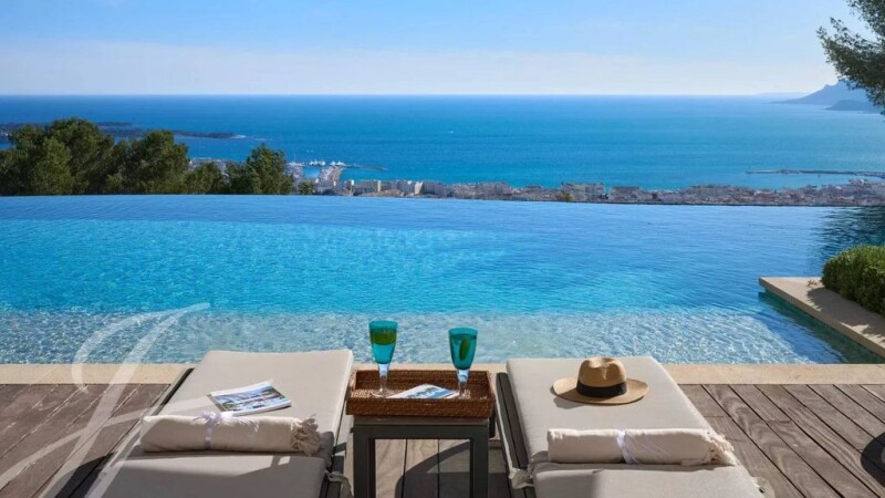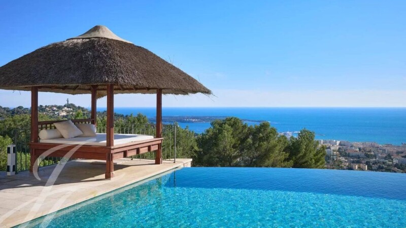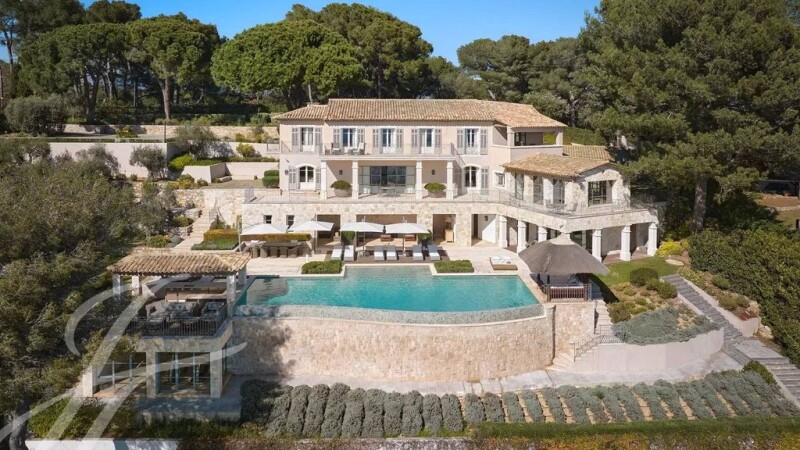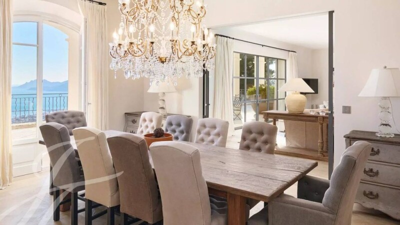 Co-exclusivity. Situated on the heights of Cannes' most coveted hill, this sumptuous property enjoys spectacular panoramic views over the bay, the Lérins islands and the Estérel massif. Completely renovated in a contemporary Provencal style, the property combines refined decor, soft colors and top-of-the-range amenities to create a natural ambience in an idyllic setting representing the art of living in Provence. The villa's interior and exterior design is dedicated to the comfort of its occupants. First floor: entrance, master suite opening onto south-facing terrace with sea view, dressing room, bathroom, shower and toilet; second bedroom opening onto terrace with sea view, shower room and toilet; third bedroom opening onto terrace with sea view, dressing room, bathroom, separate toilet. On the garden level: a vast living room with fireplace opening onto terrace, dining room opening onto terrace also leading onto covered terrace equipped with summer dining room and guest toilet, a beautiful kitchen with wine cellar opening onto terrace, a second fully equipped kitchen with laundry room, and a bedroom with shower room. Staff house of approx. 117 m² comprising a living room with kitchenette, three bedrooms, shower room and toilet. Carport and garage. An independent bedroom with shower room is located on the pool level. Set in beautifully structured landscaped grounds of approx. 7,700 m², the attractive pool area invites you to relax overlooking the Mediterranean Sea. It features a covered terrace equipped with a lounge and summer kitchen with bar, shower and toilet. The infinity pool, which can be heated, includes a Jacuzzi. A fitness room with "Star Trac" equipment also boasts a sea view.