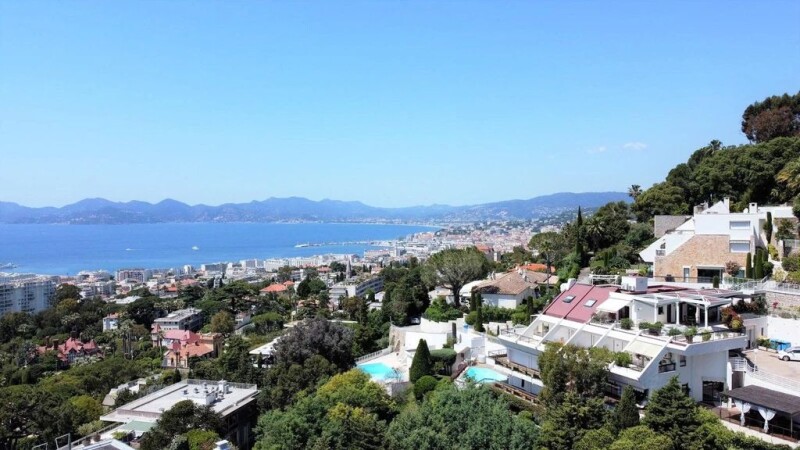Duplex villa apartment of 175 sqm with surrounding terraces of 220 sqm and a private garden of 800 sqm is on the market. Situated in the Californie area overlooking the Bay of Cannes and the Palm Beach peninsula. Accessible by lift in the common area, the property also has another access via its private garden. The residence is intimate, secure, and very quiet. The duplex apartment consists of a spacious reception room and an adjacent dining room and offers panoramic windows opening onto a large south-facing terrace. A fully equipped kitchen offers access to the “Pergola” – covered dining terrace with a view. Main level: Living room, dining room, modern kitchen, guest WC, Master suite with a full bathroom en-suite (shower, bath & WC) and a dressing room; second bedroom with a shower room en-suite & WC. The property is air-conditioned and every room offers an exit to the beautiful teak terrace overlooking the Mediterranean Sea. Lower level: a double bedroom plus a bedroom with a sofa-bed which opens onto a lower private terrace and the garden; a separate shower room; WC; laundry. Summer dining room (Pergola) communicates with the panoramic terrace facing the sea surrounding the apartment and offers access to the private manicured garden. Underground & outside parking in the residence. This small privileged gated residence has a huge swimming pool with sea views, sunbeds, WC, shower. The residence facades have been totally renovated in 2019.