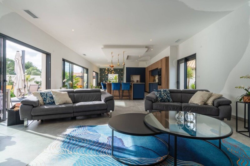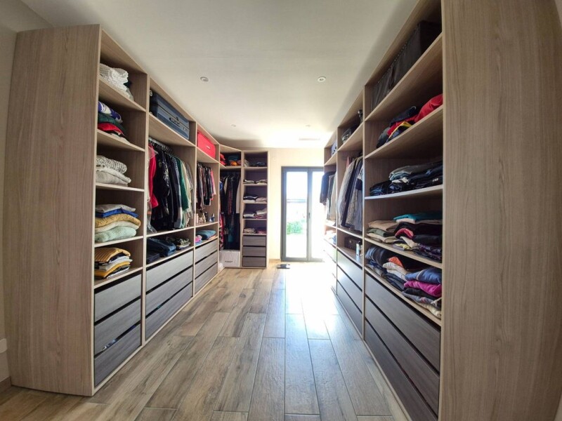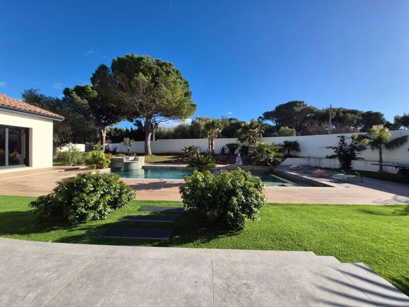 At the edge of Narbonne, a stunning property of pure elegance, this exceptional property is a true gem, standing out for its purity and elegance. Set on a 2,500m² enclosed plot with two separate entrances, it offers approximately 270m² of living space, a spacious double garage of over 50m², a wine cellar, and several terraces. The layout includes: a welcoming entrance, a stunning 87m² living area bathed in natural light and opening onto the pool area; a vast 31m² master suite with its own bathroom and a 15m² dressing room; three additional bedrooms, one of which has an en-suite shower room; a dedicated office space; and a 30m² gym featuring a sauna and shower. A 45m² independent annex completes the property, comprising a living room with an equipped kitchen, a bedroom, and a shower room. The beautifully landscaped outdoor spaces include a heated swimming pool with a counter-current swimming system and a fountain. This unique villa in the Narbonne area is distinguished by its outstanding technical features: double glazing, photovoltaic panels (with resale option), high-performance cellulose insulation (30cm), a 70m borehole, and an automated irrigation system.