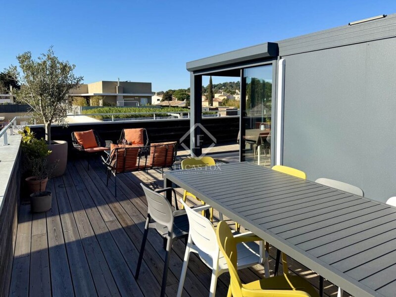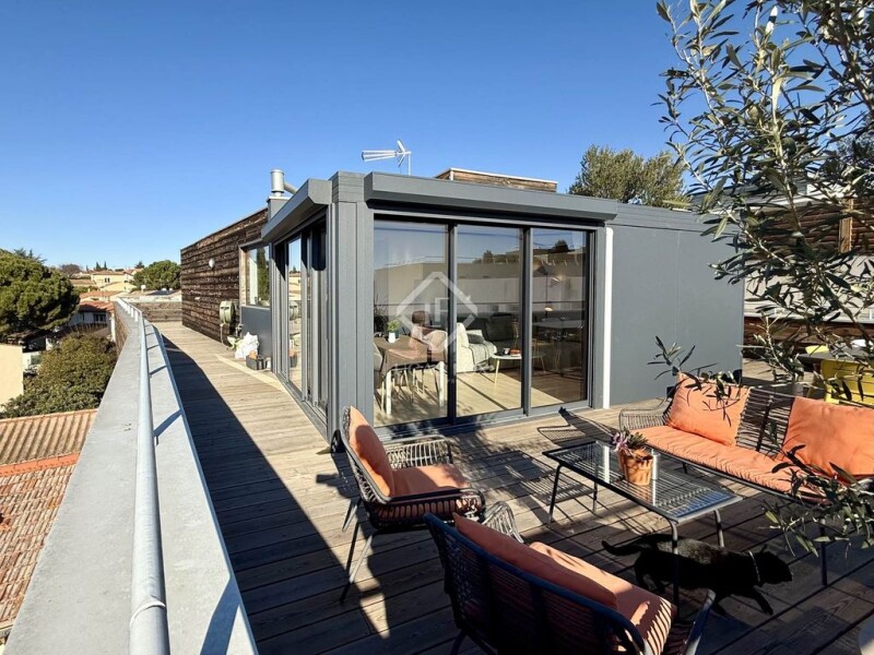 Exclusive to Lucas Fox International Properties, located in Castelnau-le-Lez, on the top floor of a recent residence, designed as a house on the roof, a real penthouse with panoramic views. Occupying the entire top floor, 71 m² rooftop composed as follows: landing, entrance, living room with veranda, open kitchen and two bedrooms that share a bathroom. All the rooms open onto a large terrace of almost 100 m² surrounding the entire apartment, an asset that you can enjoy all year round. A real hanging garden, it is ideal for sunbathing and plant lovers. Terrace on plots with panoramic unobstructed views. For more space, a 16 m² veranda could be built to add to the current 71 m². Main features: private access, air conditioning, home automation, main southern exposure, electric roller shutters, TRAM and amenities nearby. Information on the risks to which this property is exposed is available on the website: www.georiques.gouv.fr.