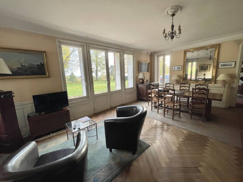 In Normandy, in the heart of the Côte Fleurie, in the town of Trouville-sur-Mer, in an exceptional environment, the Vallon de Callenville, classified as a natural area (NR) corresponding to the remarkable spaces of the Coastal law, and only 1 km from the port and the city center. Deauville Sotheby's International Realty presents for sale a most remarkable property, full of history and namely the former large outbuildings of the Château d'Aguesseau, built with a central brick pavilion, dressed in two stone wings dating from the 16th and 17th centuries. The property is built in a dominant position with a magnificent open view of the Touques valley and has a surface area of approximately 415 m² of living space, raised on the garden level, a straight floor and a floor under the attic. In addition, a partial basement. Hidden from view, access to the property is secured by the presence of a gate opening onto a beautiful avenue of century-old lime trees. The landscaped park, with its many "Boulingrin" green flowerbeds, is also home to many subjects (cedar, maples, etc.). The large outbuildings offer 16 main rooms arranged as follows: On the ground floor: An entrance with terracotta tiles and a first staircase, a living room with fireplace, French ceiling, English slatted parquet flooring, woodwork, library elements and niche, this room opening through a French window onto the exterior, a Napoleon III period dining room with herringbone parquet flooring, moldings and opening through a French window onto the park, a kitchen with old terracotta flooring and a utility room, parquet flooring, a second entrance, a hallway, an old kitchen and a laundry room with stone cabochon flooring. In the basement (accessible by internal staircase): a cellar with an oil boiler and tank, hot water tank. On the 1st floor: Right wing: a first bedroom with wardrobe, two openings onto the park and a bathroom, herringbone parquet flooring. Left wing: a hallway, a bathroom with double sink, bathtub and toilet (park view), two beautiful bedrooms with woodwork and moldings, a bedroom (old part), a hallway, a shower room with toilet (street side), a large corner bedroom with exposed beams, herringbone parquet flooring. On its second floor: seven bedrooms, bathroom and two shower rooms. A so-called exceptional property, one of the most remarkable, structural elements (facade, roof) in good condition, very beautiful workmanship with the most elegant symmetry, magnificent panoramic view of the countryside with a very beautiful landscaped park, preserved period materials, a real family home, with a unique atmosphere in the region….