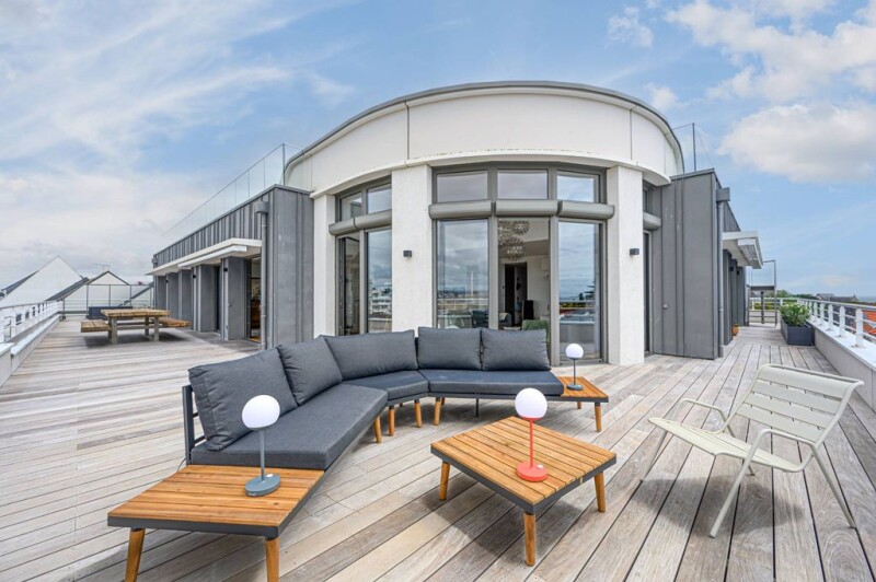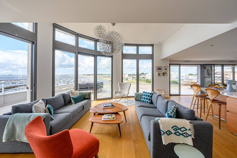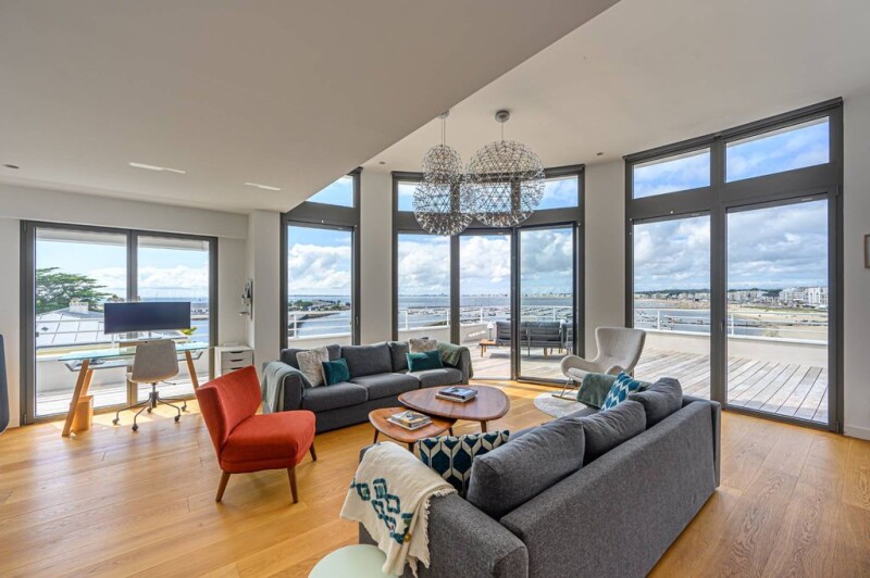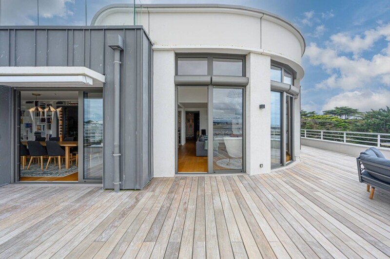 Set in a luxury residence, this sumptuous penthouse facing the sea on the top two floors is one of Pornichet's rarest properties, entirely furnished with taste and design. The apartment extends over 220 m2 of living space and 280 m2 of terrace, all with a breathtaking 360° view over the Bay of La Baule and the Atlantic Ocean. A private elevator access leads to the apartment's entrance, where you'll find a hallway leading to a large living room, a dining room, an open-plan kitchen fitted and equipped with prestige appliances, and a wine cellar. A second living room with kitchen. 4 bedrooms, including a sumptuous master suite with hammam wellness area. All opening onto a first large terrace with plenty of space for entertaining. The upper floor offers a second impressive terrace with bar for summer evenings overlooking the Atlantic. A swimming pool project is available. Numerous garages and cellars complete this exceptional property.
