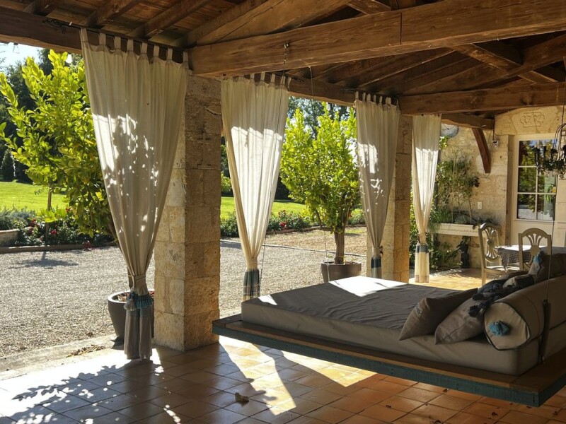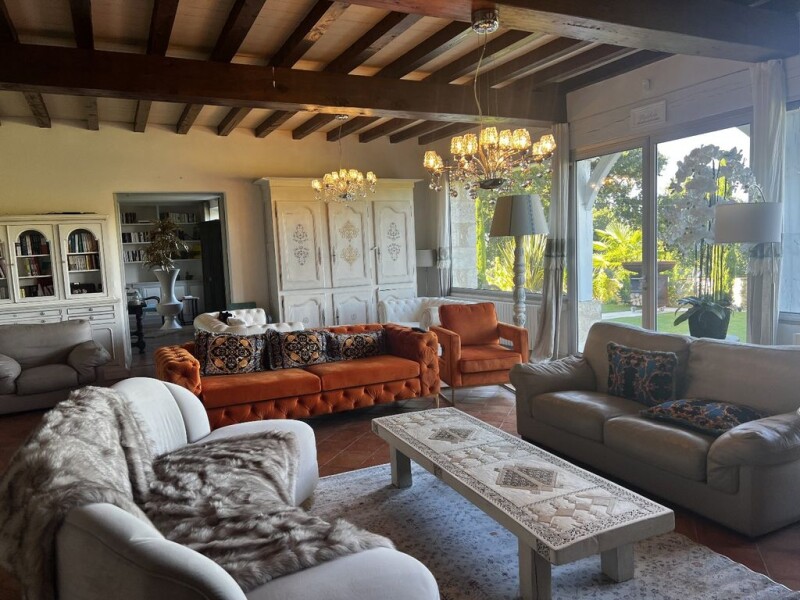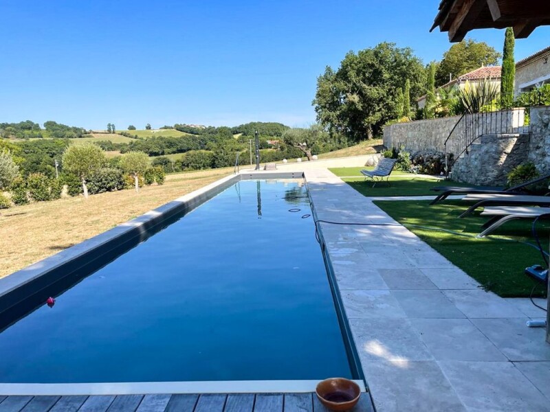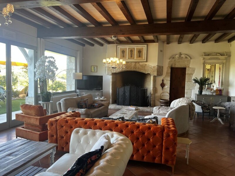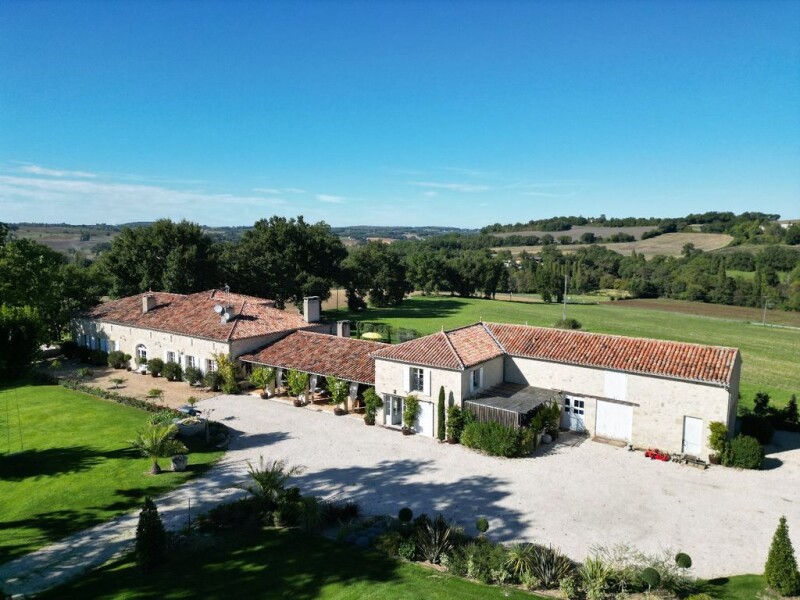 Overview A beautiful chartreuse-style stone house with guest house, set in delightful private gardens with lovely countryside views close to one of the Gers' most historically interesting villages. Renovated to a high standard and set over two floors, this property is ideal for hosting with its seven bedrooms and children's dormitory. Wandering around we can't help but imagine large family gatherings or delightful soirées in the generous entertaining spaces. Outside, a wonderful terrace overlooks a large swimming pool, and a second, covered terrace is the perfect lounging area complete with hanging day bed. As well as the large living and dining rooms, the cinema room, playroom and summer kitchen add to the entertaining possibilities, ensuring total relaxation and leisure. We approach the property through grand ornate iron gates and along a winding gravel drive surrounded by gardens on all sides, thoughtfully planted with flowers, shrubs and trees. Ample parking space is available at the end of the drive. The main house We enter through double-glazed, hand painted wooden doors into a large entrance room with chequerboard tiled floor and an elegant working fireplace. Head straight through glazed double doors into a hallway from which three double ensuite bedrooms can be found. All are beautifully appointed with modern shower rooms and WCs, some with double-glazed doors that open directly onto the impeccably maintained gardens. Further along the hallway is a handy storage room with built-in cupboards, and another part-glazed door leading out on the terrace. The ground floor living areas Back in the central hallway, we enter a room currently used as a study and fitted out with handmade bookshelves. We are then drawn to a large dining room which flows seamlessly to the kitchen and spacious living room. The suspended view from these rooms is mesmerising and the owners have ensured it is fully captured from all angles by adding full width windows and central double-glazed doors along the entire wall. Light floods the room and, in cooler months, the grand stone fireplace is the perfect place to cosy up in front of a roaring fire with a good book. With its terracotta floor, laid throughout the entire ground floor, exposed beams and impressive stone fireplace this room is full of character and an exceptionally serene place to relax. At the other end of the hallway are some practical utility spaces including a WC, laundry room and more cupboards. The kitchen The modern kitchen is accessed via the dining room as well as from the outside covered terraced. It has been decorated in a cheerful orange colour scheme with induction hob, fitted oven and plenty of fitted base and wall cupboards. The first floor We climb the original oak stairs beneath a stunning glass chandelier and arrive at a landing from which the master suite can be accessed. The bedroom benefits from a large adjoining shower room with a separate WC, a vast walk-in dressing room fitted with open wardrobes and hanging rails. Also on this floor is a cinema room and and a children's bedroom / playroom with eight sweet cabin beds prettily dressed with curtains through which we can imagine tiny giggling faces peeping. A door from the cinema room opens into a warm and immaculate attic area which doubles as a laundry drying space but could be developed into an additional room. The indoor-outdoor leisure spaces Alongside the kitchen is an attractive and inviting covered terrace area with tiled floor and original beams. Decorated in Moroccan style, with comfortable hanging beds, softly draping fabric and sheer floor length curtains which float pleasantly in the wind, it is the perfect place to relax or host an aperitif on a hot summer's evening. Further along the terrace, a games room offers additional entertainment thanks to its pool and football tables, and next to it a summer kitchen links back to the inside of the main house. The guest house Accessed from both the garden terrace and the main gravel driveway is an adjoining two-bedroom cottage offering additional accommodation for friends and family, which could also be used as a self-contained guest house. It is modern in style and beautifully appointed, yet retains original features including wooden beams and stone walls. We enter through glazed doors into the bright living room with its smart, modern floor tiles. Ahead is a modern staircase and the kitchen, with wide double-glazed doors that lead out onto one of the two covered terraces, with lovely views across the garden and the woodland beyond. The kitchen is smart with white cupboards and marble effect worktops and a built-in fridge freezer, induction hob, cooker and cooker hood. Alongside is a WC and sink and a laundry room. Upstairs we find two large bedrooms, each en suite with large shower cubicles and modern sink units. Both rooms are stylishly decorated yet retain elements of period charm thanks to the high-eaved ceilings, wooden beams and floors. One bedroom looks out across the rear garden and the other over the front garden, both with beautifully planted flower beds alongside lush lawns. The guest house benefits from its own covered terraces, beautifully styled and with attractive privacy screens, contemporary lighting, built in seating and pretty planting. The outdoor space and gardens At the far end of the main house is a large workshop and a garage, the latter benefitting from a new electric door. The spaces could be connected but for now each offers ample storage space for garden equipment and vehicles. The setting for this property is simply delightful and the current owners have taken great pride in ensuring the surrounding gardens and terraces are thoughtfully planned and planted with a mix of flowers, shrubs and trees. The terraced areas to the rear are immaculate with pergolas, barbecue areas, outdoor lighting, stone walls and planting alongside which soften the space and create a feeling of privacy whilst making the