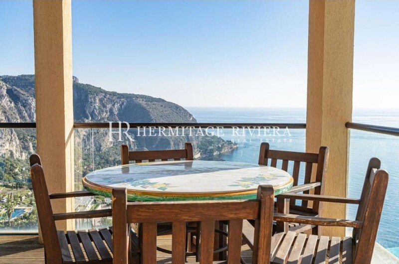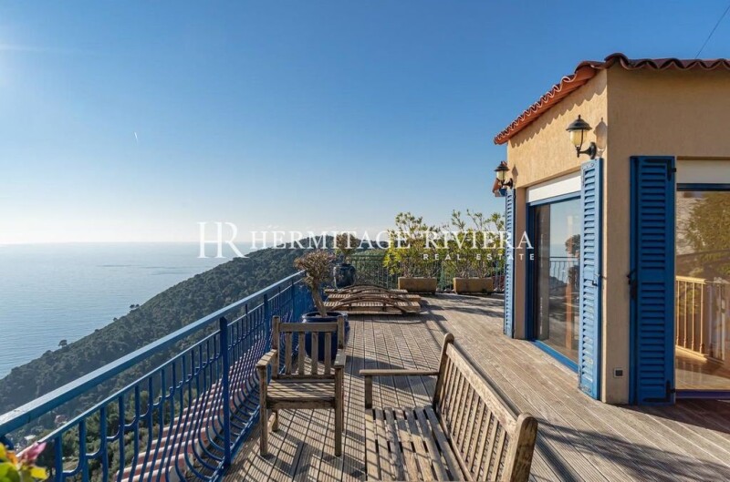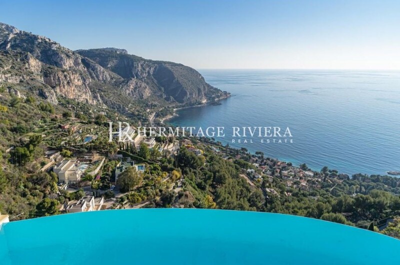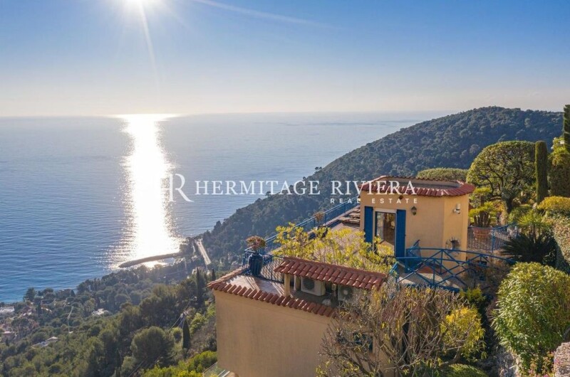 Located between Nice and Monaco below the moyenne corniche with access by a private funicular, magnificent villa on a terraced plot of 1500 m2 with several terraces and gardens as well as an infinity pool overlooking Eze -sur-Mer. The villa is composed of 3 levels: the living space at the level of the swimming pool with a large double living room - dining room and a large equipped American kitchen. Upstairs is the sleeping area consisting of 4 bedrooms including the master bedroom, a bathroom with jacuzzi, 2 shower rooms, dressing room. A beautiful terrace with barbecue area An infinity pool, a very pleasant garden area with fruit trees and vegetation. An outbuilding consisting of two bedrooms, a bathroom and a laundry room. A large garage that can hold 3 cars + 2 parking spaces.