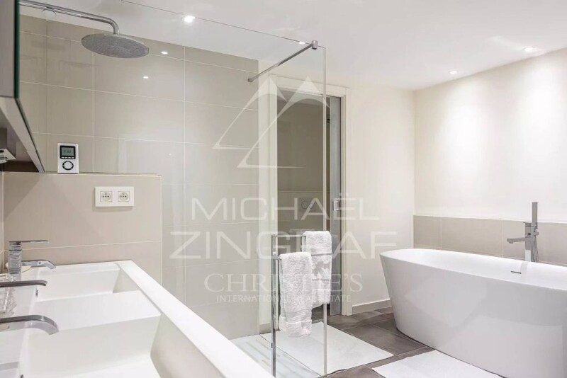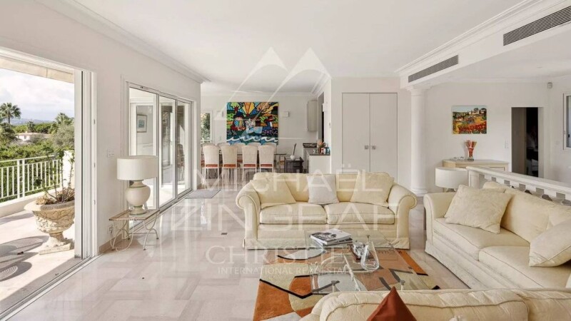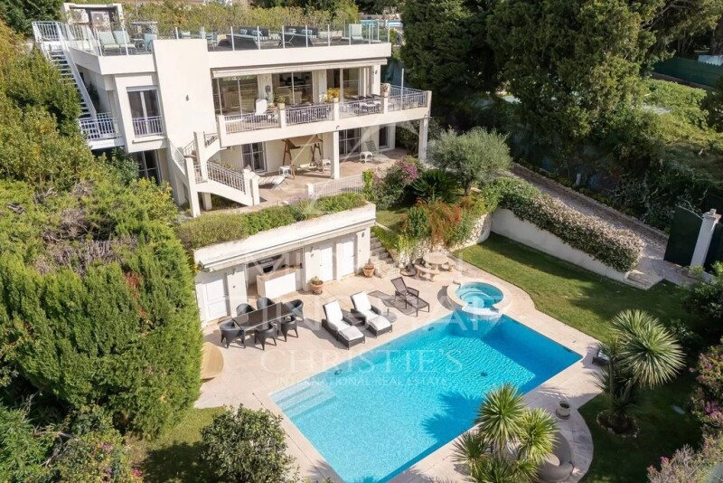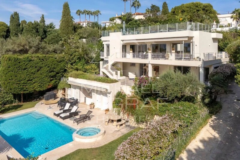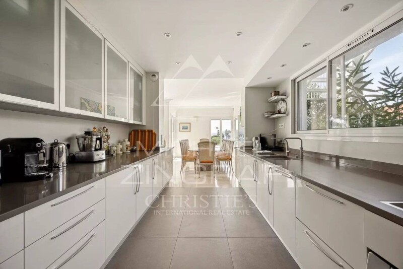 Cap d'Antibes - West Side: Nestled in a sought-after area just 300 meters from one of the most beautiful beaches on the French Riviera, this stunning Californian-style villa offers a serene setting and breathtaking panoramic sea views. With approximately 220 m² of living space, the property features a spacious living room that opens onto an elegant terrace, a welcoming dining room, a fully equipped kitchen, and an en-suite bedroom with its own bathroom. The lower level hosts four additional bedrooms, including a luxurious master suite, as well as a laundry room, all of which have access to a delightful shaded terrace. The beautifully landscaped 1,150 m² garden surrounding the villa includes a lovely swimming pool, a summer kitchen, and a jacuzzi, ideal for relaxing moments. Additionally, the rooftop terrace of approximately 120 m² on the top floor offers a stunning, unobstructed sea view. A closed garage for two cars and several outdoor parking spaces complete this exceptional property.