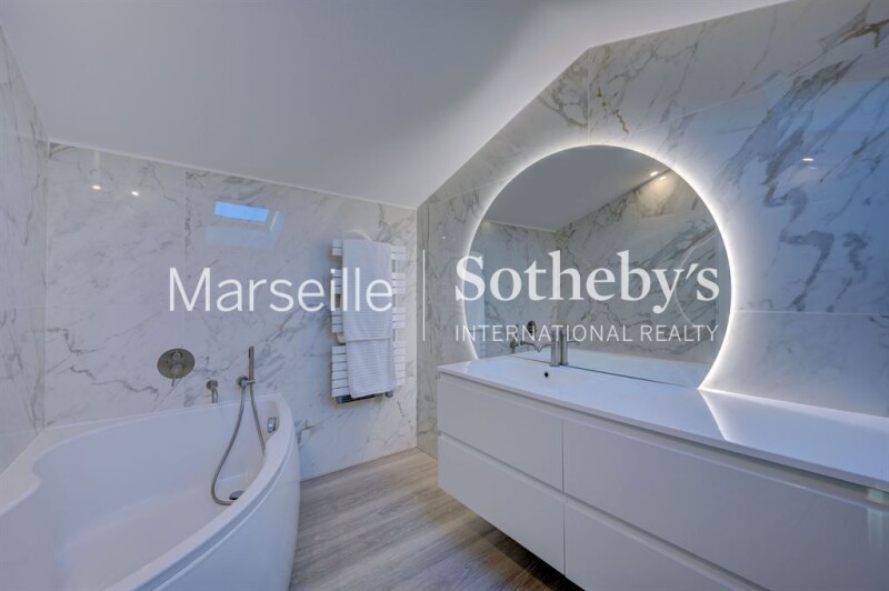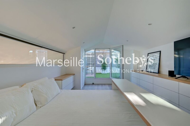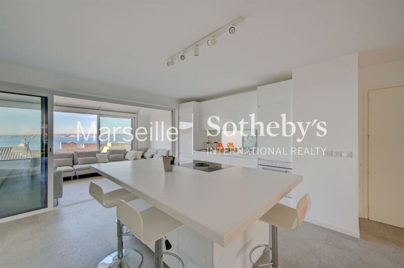 For sale in the 8th arrondissement of Marseille, Madrague de Montredon, duplex penthouse on the top floor with sea view, 3 bedrooms, and a rooftop. Discover this 133 sqm property located 5 minutes walk from the beaches and enjoying village life. This duplex offers a through living space with, on one side, a terrace overlooking the mountains of the Calanques Park, and on the other side, its veranda with a sea view. This bright space accommodates the living room and its open kitchen, as well as the first 2 bedrooms with their bathroom. The upper floor leads you to the master suite with a bathroom, then takes you to the rooftop, ideal for enjoying summer evenings with a 360° view of Marseille and the sea. Double garage included.