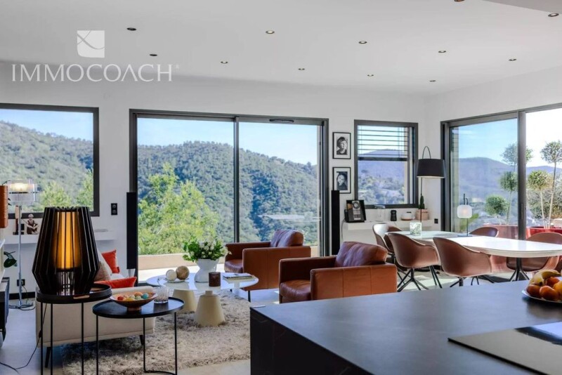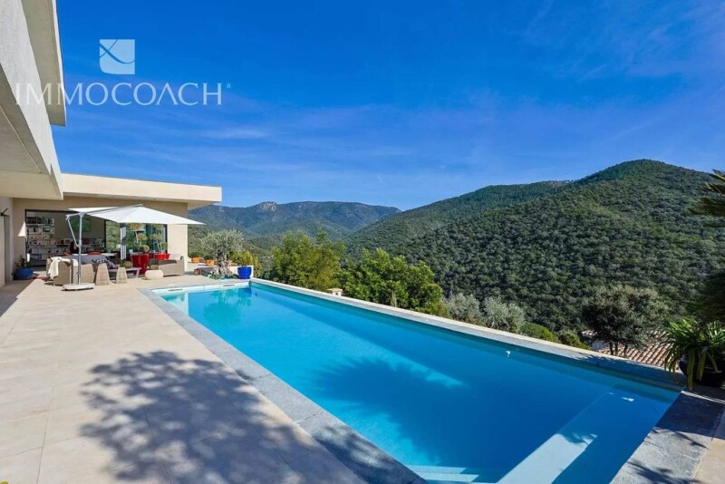 La Londe les Maures, in a private estate very close to the famous golf course, if you're dreaming of space, come and discover this contemporary villa offering generous volumes with, on one level, a very bright living room with its modern open-plan kitchen opening onto a terrace with swimming pool and 40 m² pool house, 2 en suite bedrooms with dressing rooms, an office and a pantry. Upstairs you'll find 3 beautiful en suite bedrooms with terraces/solarium. This contemporary villa offers incredible views of the hills, golf course and sea, and the atmosphere inside is very serene, with dreams of idleness and tranquillity. A double garage completes the comfort of this villa. The beach is just 5 km away and the golf course 500 m. Ideal for a second home.