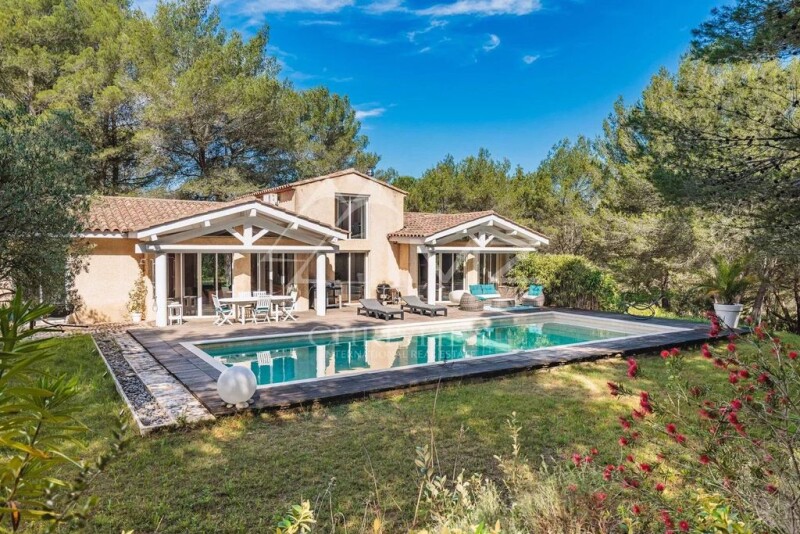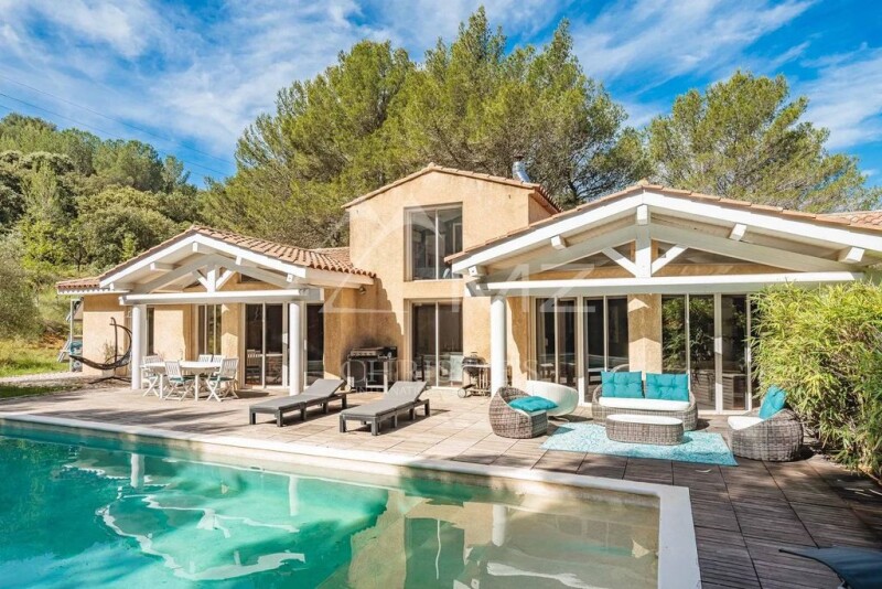 In a wooded and quiet setting, discover this architect-designed property combining charm and modernity. Ideally located in a typically Provençal village, it offers a peaceful living environment while being close to all amenities. The main house consists of a large bright living room with a fireplace, two fully equipped kitchens, a dining room, a spacious parental area, an office, as well as a second suite upstairs. The independent type 2 accommodation has a living room with kitchen, a bedroom and a bathroom, ideal for welcoming guests or for generating additional income by renting it seasonally. Outside, a vast garden of about 1 hectare with trees and a sunny swimming pool invites chilling and conviviality. Furnished relaxation areas allow you to fully enjoy the mild Provençal climate. État des risques et pollution: réalisé (null).