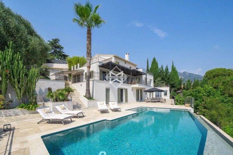 A very beautiful villa of approximately 375m² located in Roquebrune-Cap-Martin, offering stunning views of the Mediterranean Sea, the French mountains, and the Italian coast. Completely renovated in 2021 this family villa combines traditional elegance with modern design. It comprises a spacious independent kitchen, a living-dining room with a fireplace, 5 en-suite bedrooms including an independent apartment as well as an annex studio. The 1800m² garden, adorned with numerous fruit trees, features a saltwater infinity pool, four beautiful terraces all with sea views, a garage, and a carport. Agency fees payable by vendor - Montant estimé des dépenses annuelles d'énergie pour un usage standard, établi à partir des prix de l'énergie de l'année 2021 : 1728.2€.