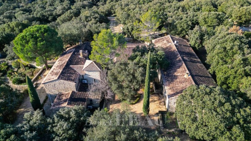 Sole Agent : This near 410 sqm property set in 30 hectares of enclosed grounds and commanding a panoramic view is located 10 minutes from Uzès. Three separate buildings which could easily be united include a 227 sqm main house, a 138 sqm guest house and a 44 sqm apartment. Each of the refined and cosy living rooms feature fireplaces, and the ensemble includes 9 bedrooms in total. The grounds include about 2 hectares of truffle oaks, and feature two swimming pools and a tennis court, as well as a double garage. A haven of peace hidden from view and just a few minutes from picturesque Uzès and the amenities. État des risques et pollution: en cours (null).