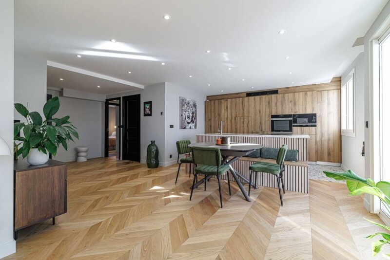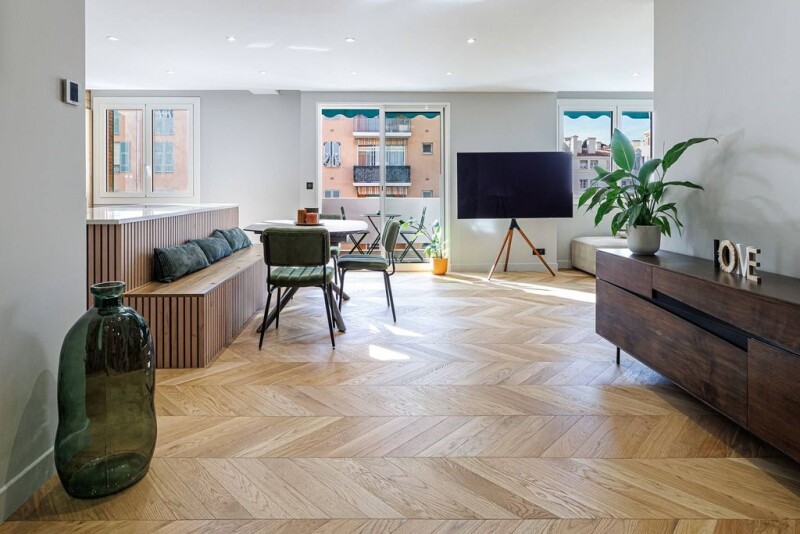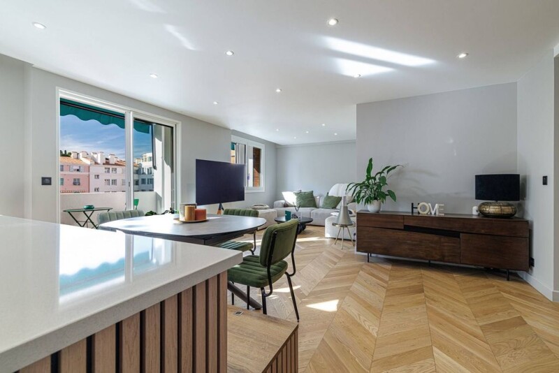 This elegant 73 m² high-floor apartment has been fully renovated with premium materials and artistic style. The entrance with built-in storage leads to a spacious double living area with an open-plan kitchen, dining space, and lounge. A balcony accommodates a table and chairs, offering a lateral sea view. The apartment features one bedroom with storage and a master suite with ample wardrobe space. It includes air conditioning for added comfort. Ideally located steps from the sea, harbor, and port, it offers easy access to buses and the tramway. The building has an elevator, resident parking, and a private cellar.