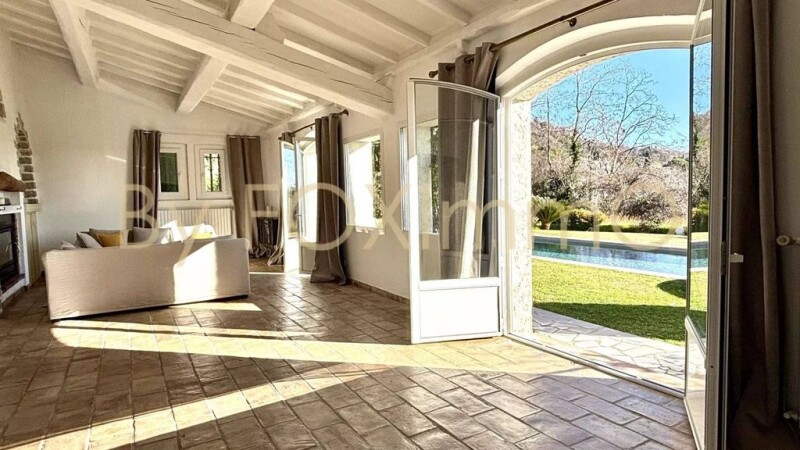 Ideally located in a highly sought-after residential area of Vence, yet close to the centre with easy access. This superb, charming property boasts panoramic views of the sea and surrounding hills. It is in a dominant position, perfectly exposed, in absolute peace and quiet and nestled in greenery away from all eyes. The house has been tastefully renovated using quality materials, giving it an exquisite Provencal charm. The villa comprises an entrance hall with separate toilet, a living room with fireplace, a dining room with high ceilings, a large, recently fitted kitchen with adjoining pantry, and a ground-floor en suite bedroom with bathroom and dressing room. The well thought-out layout of the entire first floor gives direct access to the garden and swimming pool. Upstairs, on the garden level, there are two passageways leading to the night space. On one side is a sumptuous duplex master bedroom with a sports room, a vast bedroom, a shower room, a boudoir/dressing room and a study. On the other, two additional bedrooms with en-suite shower rooms. The outside space is absolutely magical and will not leave you indifferent. You will enjoy a huge terrace with a bioclimatic pergola offering a luxuriant relaxation area, a heated salt water swimming pool with its jacuzzi. You will be able to take full advantage of the grounds thanks to the large, perfectly laid-out terraces, stone walls, petanque area, fruit trees and flowerbeds, all of which are perfectly tended and organised. A very large garage and several parking spaces complete the property. As an added bonus, planning permission is in the process of being obtained for a second 130 m² (1,399 sq ft) 4-bedroom house in the lower part of the grounds, so there is no nuisance to the main building. The location, the charm of the house, its perfect condition, the views and the peace and quiet make this a quality property that is very rare on the market and one that should not be missed. A visit is a must! We are at your disposal Agency fees included The risks to which the property is subject are available on the Géorisques website. Ref 3555 DRAYBE.