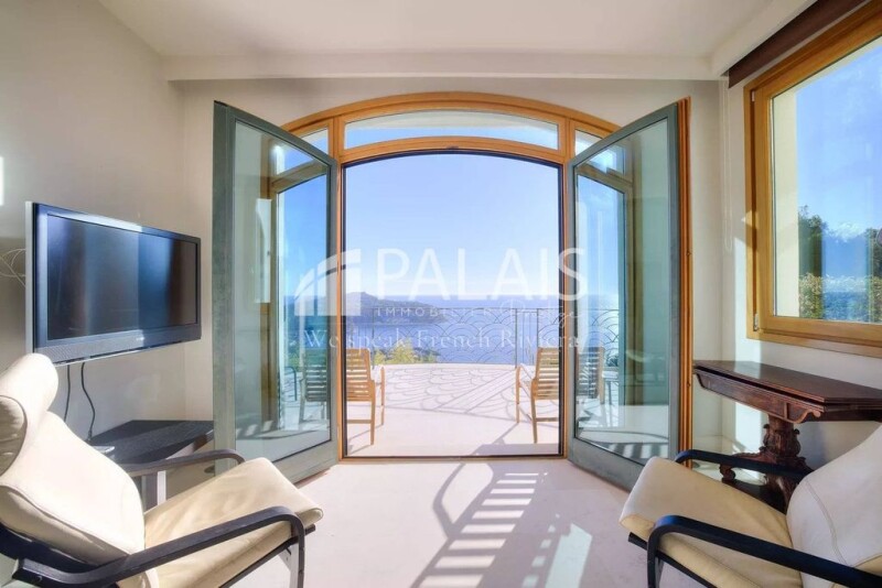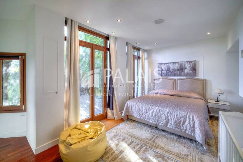 Situated on Boulevard Leopold II, at one of the most exclusive addresses on the French Riviera, this 5-bedroom family home spanning 450m², of which 357m² are habitable, is a gem set within its lush 1000m² garden. It comprises three levels, all bathed in light through immense south-facing windows that open to an iconic view extending from the bay of Villefranche to Saint-Jean-Cap-Ferrat. A veritable haven, it boasts two pools, one outdoors and a second covered indoor pool, along with a relaxation area and spa featuring a sauna. Each of its 5 bedrooms is ensuite with its own bathroom and dressing room. They all enjoy spacious living areas and unparalleled brightness.