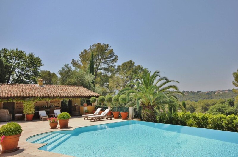 Private property situated on a plot of 3.5 ha in a closed domain with 4 private villas. Panoramic view towards the Royal Mougins Golf Club and hills. The main villa offers: a living room with fire place, dining room. Equipped kitchen. Master bedroom ensuite on the 1st floor and 2 guest bedrooms ensuite on the ground floor. Floors finished in original Provence tiles. Beautiful terrace with big pool. Pool house with equipped kitchen and BBQ, Office of 30 m2. Guest house: totally renovated in 2008, it offers a living with open kitchen, 2 ensuite bedrooms. Large terrace with a very nice view towards the golf. Garden and carport for 2 cars. Garage of 60 m2 for 3 cars. The garden of 13665 m2 and the forest of 22316 m2, in unlimited in time right to use, with old pine and oak trees. It allows to make quiet walks in the nature.