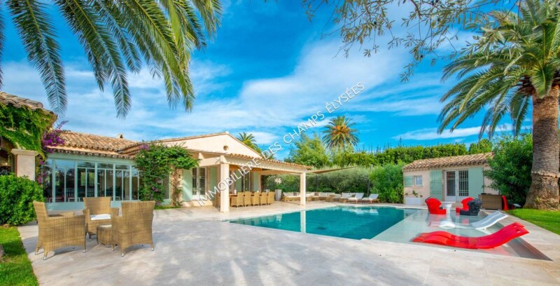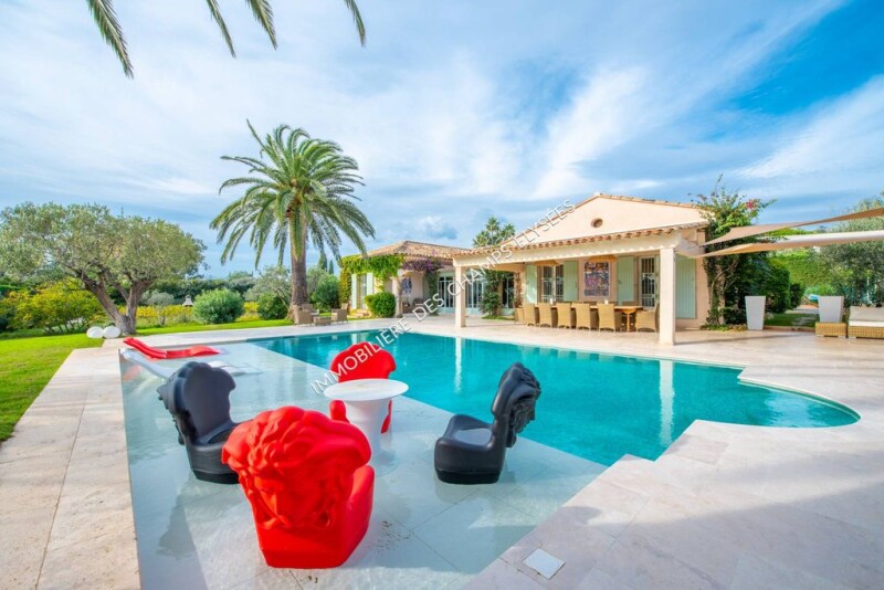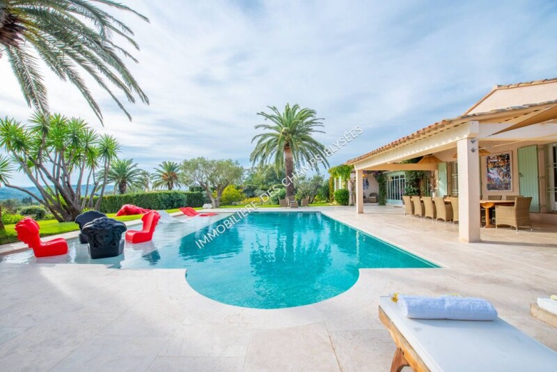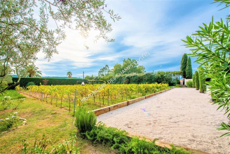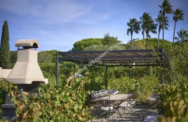 At the entrance to the Parcs de Saint-Tropez estate, in a quiet area, on fully landscaped and wooded grounds of 6.545 sqm, facing south, we offer a beautiful single-storey villa of 350 sqm in perfect condition. and maintenance. The property includes 7 complete rooms in total including 2 service rooms in a caretaker's accommodation and numerous outbuildings. Parking for 10 cars, pool house, swimming pool, 200 m² of terraces, vines. The park is magnificent, the view very clear, not overlooked.
