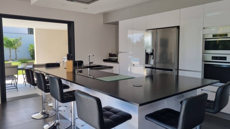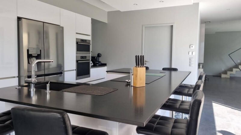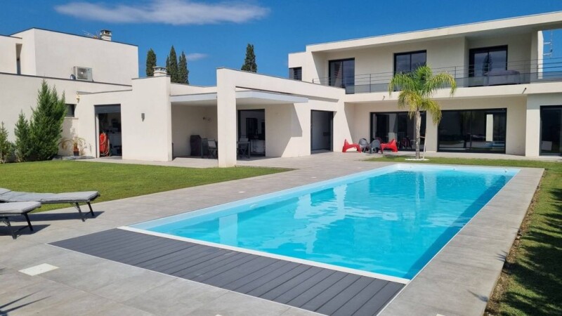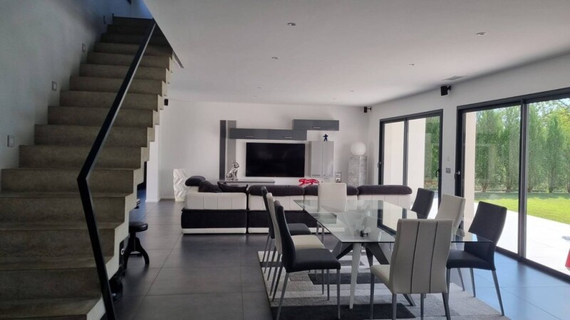 Contemporary villa with around 226 m² of living space, built on a lovely, south-facing 885 m² plot planted with trees, in a sought-after residential area close to the city of Perpignan. The ground floor comprises an entrance hall with a toilet and wardrobe, a very bright living room opening onto the garden and patio, an open-plan fitted kitchen with a central island opening onto a covered terrace with barbecue facilities. The ground floor sleeping area comprises a master suite and a bedroom or study, plus a sports room. Upstairs, there are 3 further bedrooms with balcony access, a shower room and a separate toilet. The property also features a double garage with a mezzanine and technical room, indoor and outdoor parking space for easy parking. The outbuildings include a storeroom, a utility room, and a covered courtyard. A host of features, including a saltwater swimming pool, reversible ducted air conditioning, double glazing and RT2012 building standards, will ensure you the comfort and peace of mind you're looking for. The house is still covered by a ten-year warranty.