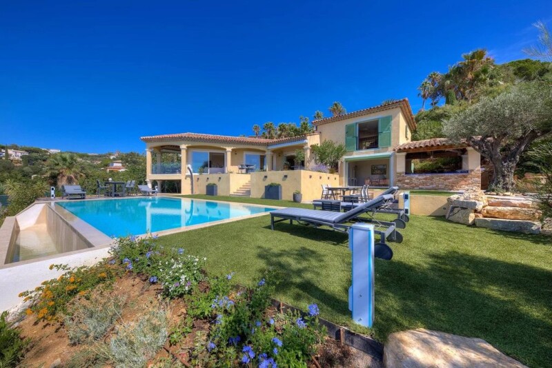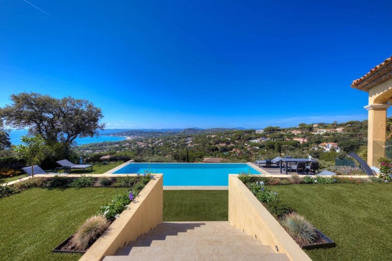 Exceptional panoramic view of the sea, the Village, and the Gulf of Saint-Tropez for this superb property with Provencal architecture, combining modernity and authenticity. Ideally located in the heart of a secure domain in an ultra-dominant position, it offers a breathtaking panorama that is simply mesmerizing. This charming residence, with an area of approximately 216 square meters, features beautiful living spaces, including a living room with a fireplace, a dining room, a large new fully equipped kitchen, and 5 bedrooms, including a studio on the upper floor. Nestled in a haven of peace and tranquility, the lush 1237 m2 landscaped garden, with Mediterranean plants, boasts a heated infinity pool, a lovely summer kitchen, and a petanque court. Additional amenities include reversible air conditioning, double glazing, fiber optics, an alarm system, a safe, and video surveillance. This character property offers a stunning panorama of the sea, in close proximity to the Nartelle beach, within a natural and preserved environment, behind closed doors and quiet.