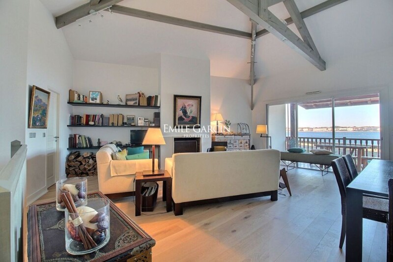 A stone's throw from the beach and in the immediate vicinity of shops with a breathtaking view of the bay of Saint Jean de Luz from Socoa. Magnificent air-conditioned reverse duplex, approximately 113 sqm, located on the 2nd and last floor with elevator, of a condominium of 5 apartments. The apartment is composed on the 1st level, of an entrance hall, an open fitted and equipped kitchen, a cathedral living room with fireplace, all opening onto a terrace with an exceptional view of the bay, the Rhune, the port of Socoa and as far as the Landes beaches. On the second level, a bedroom en suite and two bedrooms, all opening onto a terrace, a bathroom and a laundry room. For your parking, the property has a large garage with a cellar space. No work to be planned. Condominiums of 6 units ().