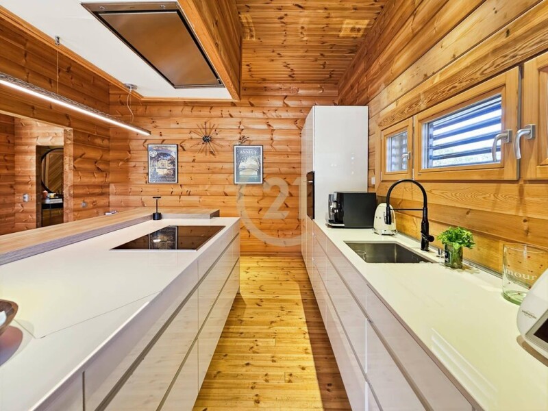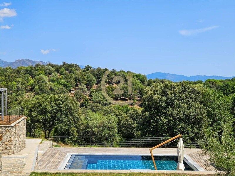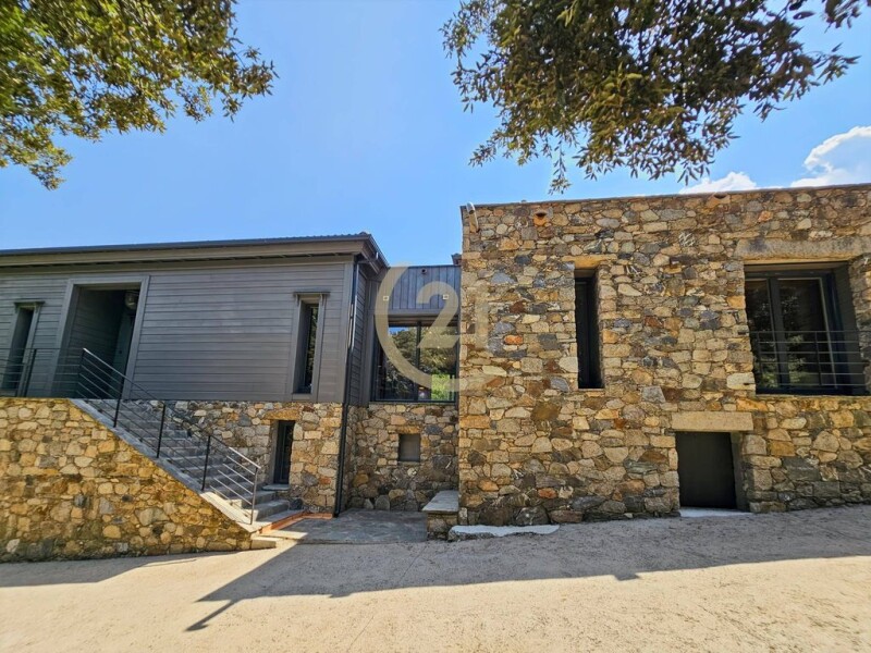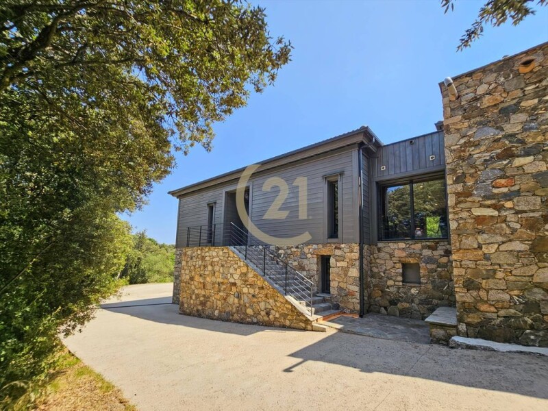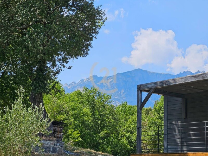 Century 21 Dary Immobilier is pleased to offer this magnificent contemporary property for sale, exclusively, just 5 minutes from the town center of Corte. Although very close to the town center, the approximately 4,000 m² property is surrounded by nature. The contemporary villa, with a surface area of approximately 300 m², is built on two levels. It consists of an entrance hall, a guest toilet, a large 72 m² living room/kitchen with a fireplace, a second living room that serves as a TV room, an office area, and a bedroom with a private bathroom. Two large suites each have a bathroom, private toilet, and dressing room. On the garden level, you will have a large double garage, a laundry room, and a gym. The property, facing south, opens onto the surrounding mountains. The villa is extremely comfortable and warm, it is built on a concrete and cut stone base, with a wooden structure using the classic technique known as "stacked solid timbers", which gives it a unique character, in terms of atmosphere, warmth and fragrance. The Nordic species used release a subtle fragrance in the home. The pool area has large terraces made of exotic IPE wood. The mirror pool is made of natural gray stone. The choice of natural materials allows the villa to perfectly integrate into its environment. Over time, the wood takes on the color of tree bark. The villa is classified A, a guarantee of controlled energy consumption. We appreciate the calm, the environment, the large volumes, the high-quality finishes, such as ducted air conditioning, slatted roller shutters, large bay windows, terraces and the pool area. A feeling of being at the end of the world and tranquility. A unique place that we invite you to come and discover in the Central Corsica region. A micro-region known for its forests, hilltop villages, granite mountains, and the crystal-clear waters of its rivers.