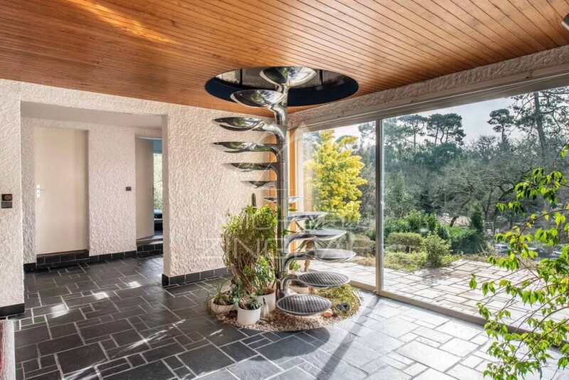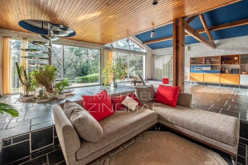 Michael Zingraf Bassin d’Arcachon presents an architect-designed house built in 1975, set on a 1,432 m² plot near the bay. Designed for a fluid and open spatial organization, it combines raw materials with an open structure. The ground floor revolves around a spacious living room with a fireplace, featuring large glass doors that open onto a south-facing terrace. The living area offers generous proportions, extended by a functional adjoining kitchen, all connected to the dining room. Three bedrooms are located on this level, including a suite with a private bathroom. A second bathroom and a separate toilet complete the floor. Upstairs, a mezzanine overlooks the living room and can serve as an office, a relaxation space, or an additional bedroom with a view of the garden. The basement provides several additional spaces: a garage, a wine cellar, a laundry room, and a storage area. Outside, a second terrace facing north allows for flexible use of spaces depending on sunlight and season. Just minutes from the bay’s beaches, this property combines architectural character with a prime setting.