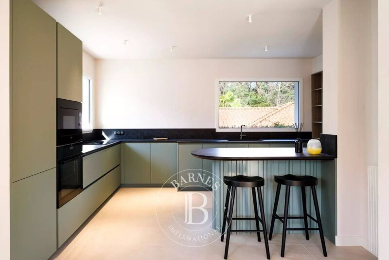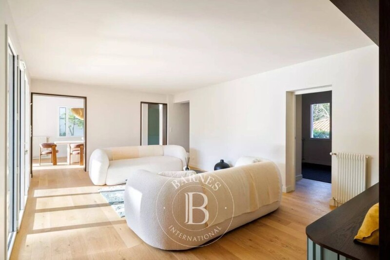Located in a green environment, half way between beaches and golf course, beautiful contemporary house of more than 210 m². Entirely renovated in 2024, it features a beautiful living room opening onto the south/ west facing terrace and 4 bedrooms (5 bedroooms possible) including 2 with shower rooms on the ground floor. The house also has a heated swimming pool and a large garage.