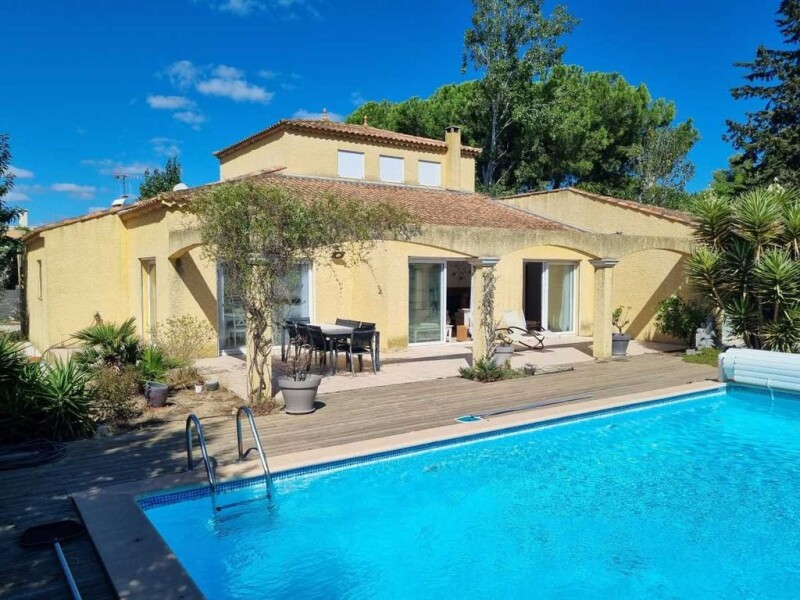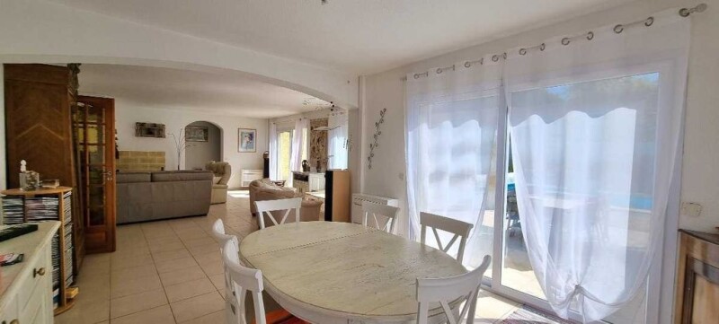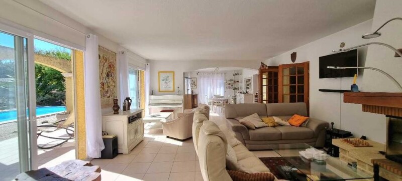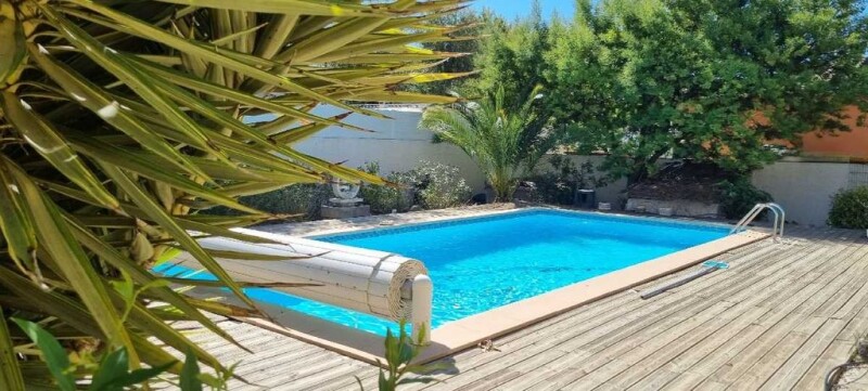 GRAU D'AGDE - 4-SIDED HOUSE 188M2 - GARDEN 1220M2 - 5 BEDROOMS - HEATED POOL - TERRACE - POOL HOUSE In Grau d'Agde, 800 meters from the beautiful blue, in one of the most sought-after neighborhoods, in a quiet alley, discover this superb 188m2 house on a 1226m2 fenced and wooded plot. On the garden side, among the magnificent trees (mimosas, pines, poplars), you will find a beautiful 10mx5m heated chlorine pool with secure cover, a borehole, a mosquito repellent dispenser, a 100m2 wooden terrace area, and a 25m2 shelter that can be used as storage or summer kitchen. On the house side, this beautiful villa offers you a vast living room of more than 50m² very bright with insert fireplace, a separate kitchen of 25m², a functional laundry room, 4 bedrooms including 3 with a separate shower room with WC, and cupboards. Upstairs is a final suite of approximately 25 m² with sunny terrace which awaits you. The entire house is equipped with reversible air conditioning, double-glazed windows and electric roller shutters. Whether you are looking for a family home with beautiful spaces or you wish to make a gîte or luxury seasonal rental, this superb villa is made for you. Fees payable by the seller Your 3G IMMO sales agent on site EI - Justine LUCAS Registered with the RSAC of Beziers 902 960 988, Tel: 06 16 44 53 40, 3gimmo website: According to article L.561.5 of the Monetary and Financial Code, for the organization of the visit, the presentation of an identity document will be requested. Information on the risks to which this property is exposed is available on the Géorisques website: www.georisques.gouv.fr.