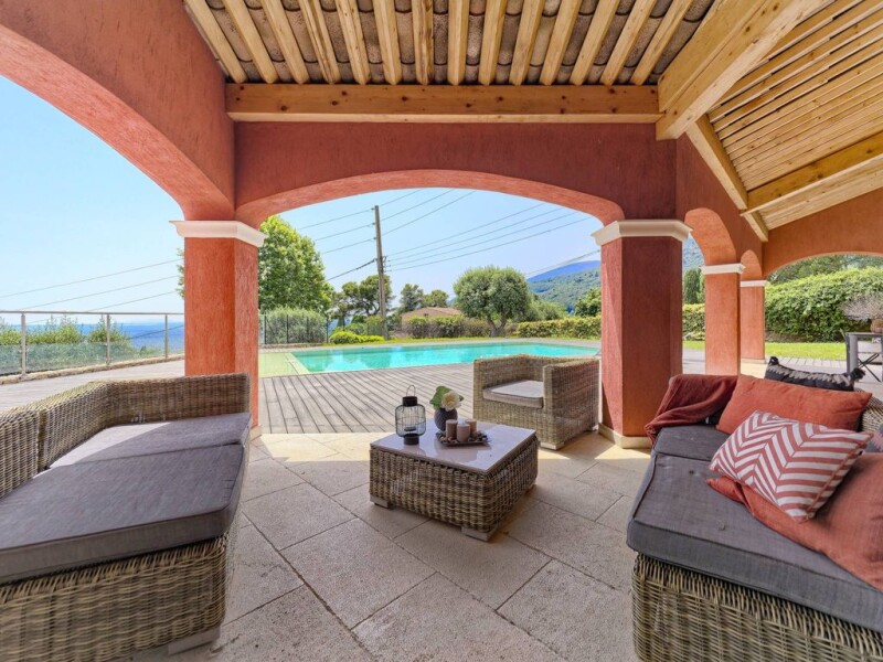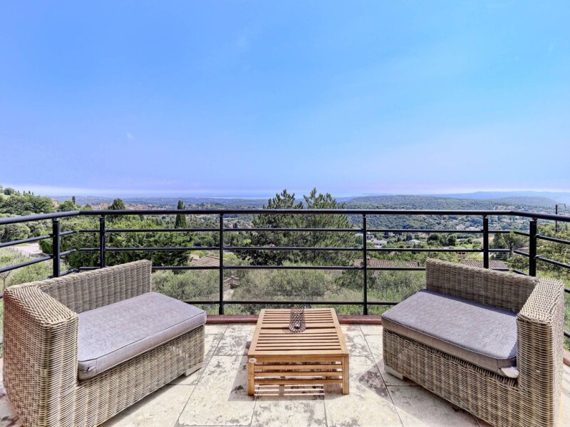 Exclusivity: Ideally located, in absolute calm, on the heights of Vence, this superb villa in a resolutely modern style will seduce you with its breathtaking panoramic sea view, as well as its generous volumes and the quality of its services... Located on a pretty terraced plot perfectly facing south, the villa built in 2010 consists of: Main level: a beautiful entrance, a spacious living room with fireplace (insert), a dining room, all very bright thanks to large bay windows opening onto the pool area, a fully equipped separate kitchen and its scullery/laundry room, two bedrooms with dressing room, a bathroom (bathtub). Upstairs: the sleeping area, consisting of two pretty bedrooms, as well as the master bedroom with its dressing room and bathroom, and its private terrace. Lower level: a huge basement of approximately 100m2 with development possibilities. Outside: a superb mirror swimming pool (salt system, heated, rolling shutter) and its lounge area under the covered terrace, will allow you to enjoy convivial moments. Magnificent garden planted with olive trees, several parking spaces. Features: Electric gate, automatic watering, alarm, underfloor heating (heat pump), reversible air conditioning, electric blinds... In summary, a "turnkey" villa, offering very nice amenities, to visit without further delay!!.