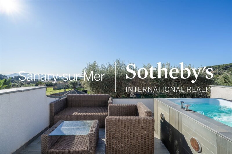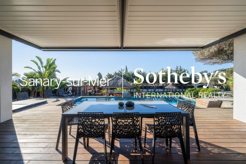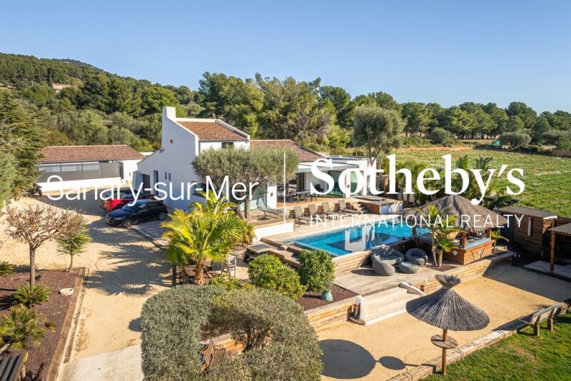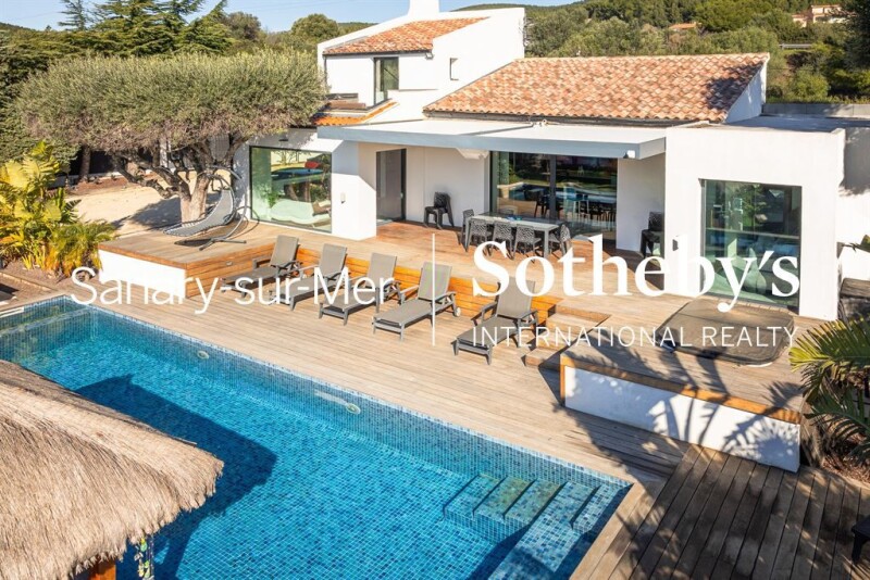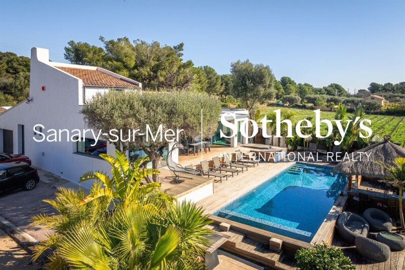 For sale in Sanary, just 10 minutes from the city center, a contemporary villa with a sea view, swimming pool, guest house, and expansive garden. Fully renovated, this 187 sqm home is nestled in a 2,000 sqm lush setting, close to the port, shops, and the renowned Sanary market. Bathed in natural light, the ground floor features a spacious double living room with an open kitchen, a master suite with a dressing room and direct access to the outdoors, a pantry, a study area, and a relaxation space that can be converted into a bedroom. Ample storage completes this level. Upstairs, a second master suite enjoys a private balcony with stunning sea views. Designed for leisure and entertainment, the outdoor space includes a large terrace, a 12m x 4m swimming pool, a jacuzzi, a pagoda, an open game room, a summer kitchen, and a pétanque court. A separate guest apartment with a private terrace adds further value, perfect for hosting family and friends or generating rental income. The property also offers ample parking space.
