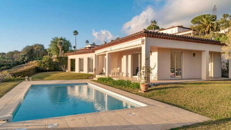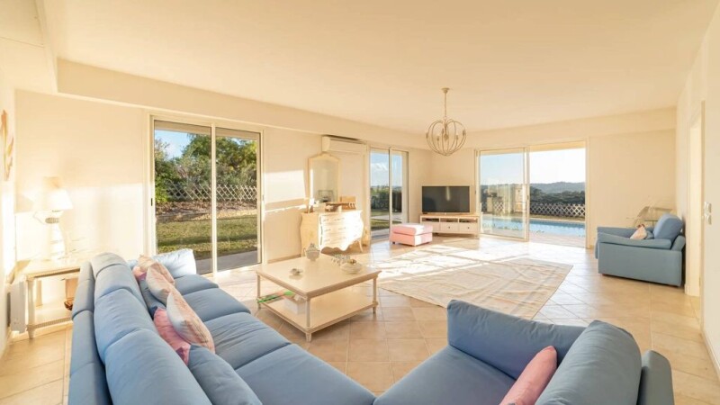Very nice opportunity to buy this independent one-level villa located in the gated Domain des Oliviers, itself located on top of the famous gated and guarded Domain des Hauts de Vaugrenier. Featuring amazing panoramic views of the sea and Cap d'Antibes, the house is located on the border of nearly 400 acres of Natura 2000 natural reserve forever protected by the European Union and perfectly quiet. The property offers a very large living room with separated dining room and kitchen, 3 bedrooms including one en-suite Master bedroom with dressing, 2 bathrooms, 2 toilets and an independent double car garage. The large flat garden in front of the house with a very nice pool enjoys exceptional views of the sea and surrounding nature. Excellent location, very close to the beaches and shops and only 15 minutes from Nice airport.