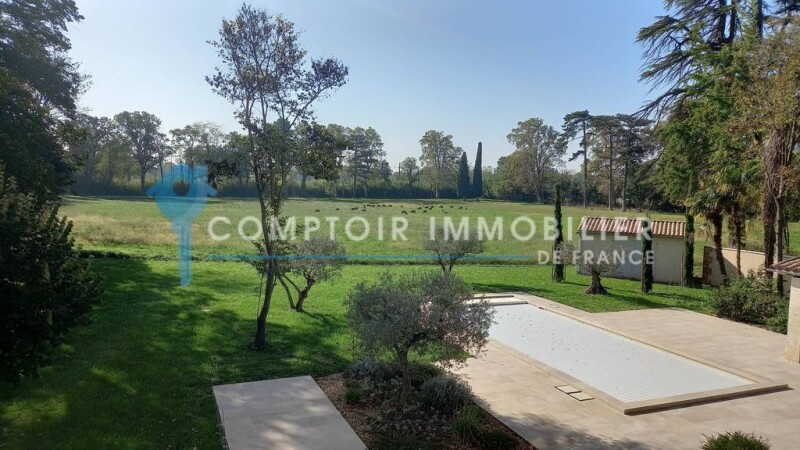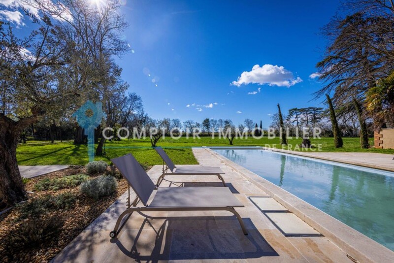 In complete confidentiality, the agency in Provence, located in Boulbon, offers you a sumptuous 320 m2 property, bathed in natural light. Large French windows open onto a vast terrace, offering a breathtaking view of the rural landscapes and flower beds, all on one hectare of wooded land. On the ground floor, you will find a large modern kitchen opening onto a TV lounge and a reading room, a laundry room, a guest toilet, as well as a suite with a shower room and toilet. Upstairs, this residence offers four suites, each with shower room or bathroom and toilet as well as a laundry room. Outside, you will discover a heated swimming pool (12x5) with submerged roller shutter as well as a summer kitchen. The little extra, no work required, the property can be sold furnished. If you would like information or come and discover this prestigious property, contact us.