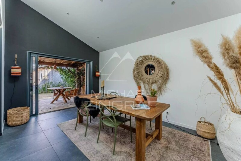 This prestigious timber frame house is located in the town of La Teste de Buch, near the port. It was built in 2017 and offers a spacious living area of 70 sqm with an open plan equipped kitchen. The sliding bay window opens onto a covered terrace, perfect for enjoying the outdoors. On the ground floor, a sleeping area has been arranged with a master suite including a dressing room and a bathroom/shower, as well as a separate toilet and a laundry room. Upstairs, there are two bedrooms with closets and a shower room with toilet. An outbuilding and a green space complete this property. The environment is calm, close to the salt marshes, providing a peaceful and pleasant living environment. État des risques et pollution: réalisé (2023-07-02).