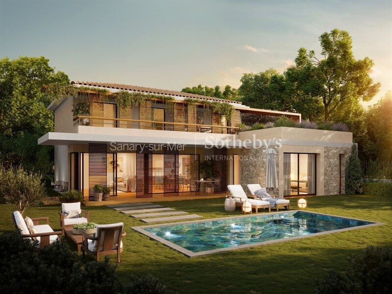 Discover a secure estate of 15 exceptional new villas for sale in Sanary-sur-Mer, offering a peaceful life close to the beach and the town center. Each villa, ranging from 130 to 141 sqm and compliant with RE2020 energy standards, includes a double garage, a private pool, and for some, an elevator. This high-end contemporary house with an elevator features 5 rooms, a south-facing 50 sqm living room, a master suite with en-suite bathroom and dressing room on the ground floor, and 3 bedrooms with private bathrooms upstairs, all opening onto a south-facing balcony. Its typical modern Mediterranean style, combining glass facades, stone, and wood, is enhanced by a landscaped garden with a pool. Equipped with an 86 sqm underground garage, a heat pump, and air conditioning. It will be ready to welcome you in the first half of 2026. Benefit from special conditions for the first 4 buyers.