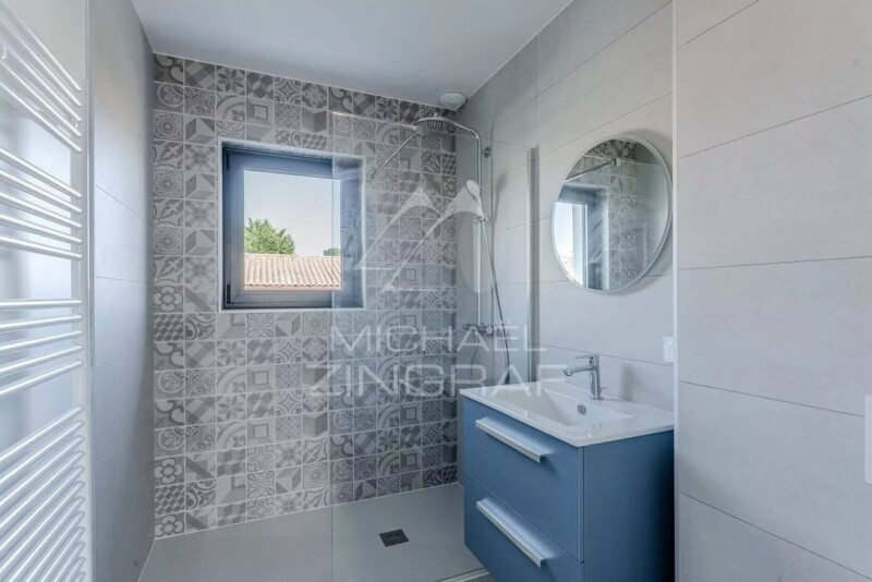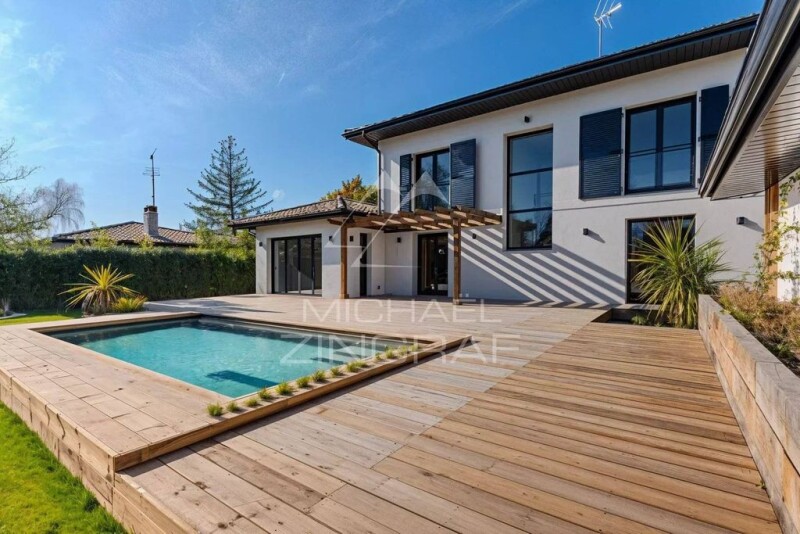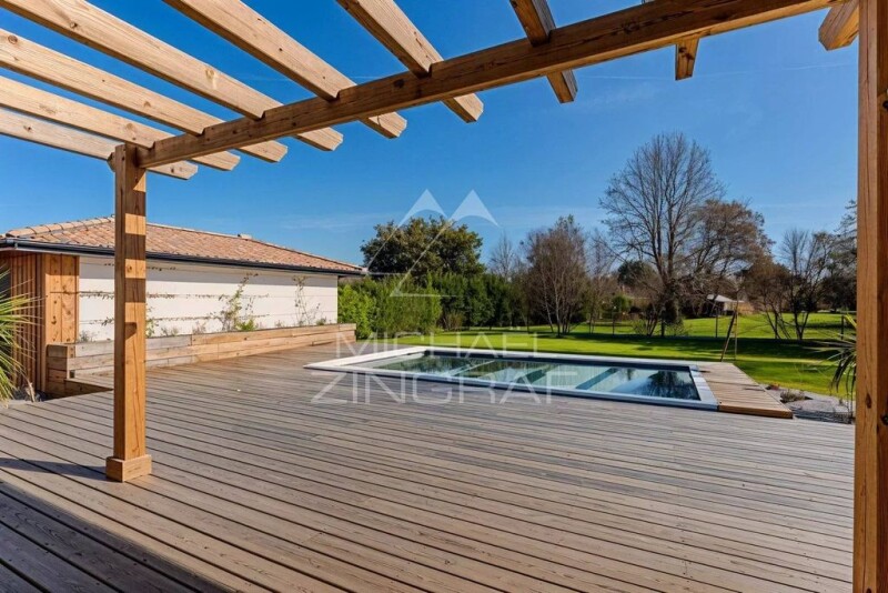 This magnificent luxury house is located in the city of La Teste de Buch, on the edge of the golf course. It has been completely renovated and offers a living area of 170m², built on a large plot of land measuring 1047m². The house is on two levels and features a spacious living room and a fully equipped kitchen, both opening onto a large 80m² wooden terrace. You can also enjoy a master suite with a bathroom and dressing room on the ground floor. Upstairs, there is a second master suite with a bathroom and dressing room, three additional bedrooms, and another bathroom. You will also have a 25m² garage, a 6*4 heated swimming pool, and a large landscaped garden. This luxury house is a true haven of peace for golf enthusiasts who wish to settle in a quiet and green environment.