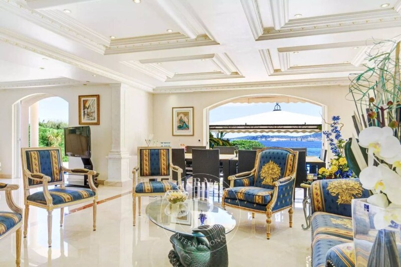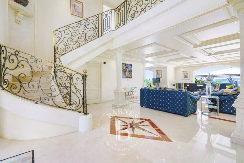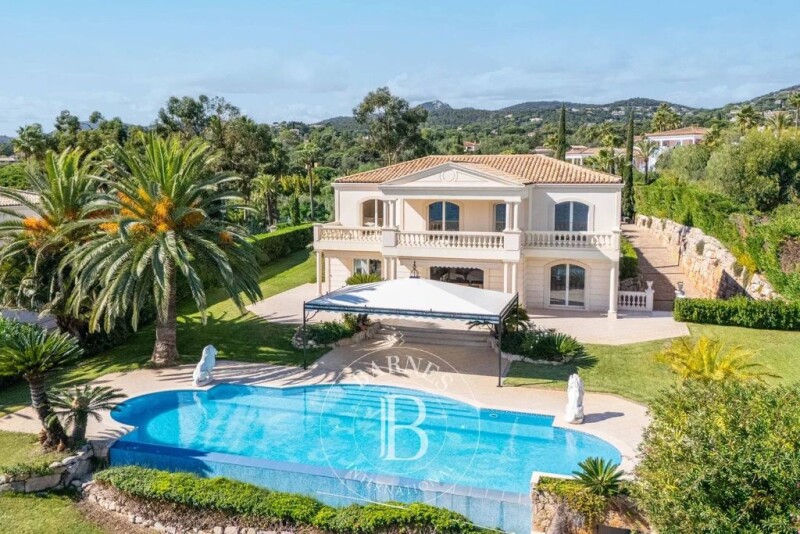 Located in the commune of Grimaud, at the heart of a private and secure estate with a caretaker, this colonial-style villa, facing the sea, offers breathtaking views of the Mediterranean and the village of Saint-Tropez. With a living area of 426 sqm, this property enjoys an exceptional panorama in a quiet, residential setting, surrounded by a flat, lush park of over 2,500 sqm. The entrance hall leads to a spacious living room, extended by large terraces that fully showcase the panoramic view. On the ground floor, you will find a fully equipped independent kitchen, a lounge, a dining room, and a bedroom with an en-suite bathroom. Upstairs, three master bedrooms with walk-in closets and private bathrooms open onto a large terrace with spectacular views. The lower floor includes a garage for two cars, a storage room, a relaxation area with a hammam, and an independent studio. Hidden from view, the landscaped garden features a large infinity pool measuring 16 x 6 meters, ideal for relaxing and enjoying the peaceful surroundings. ENERGY CLASS: C - CLIMATE CLASS: A/ Estimated annual energy costs for standard use: 2070€ - 2840€ - 2021 reference year DPE new version Agency fees payable by vendor - Montant estimé des dépenses annuelles d'énergie pour un usage standard, établi à partir des prix de l'énergie de l'année 2021 : 2451.4€.